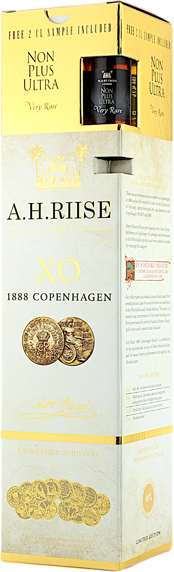 Der A.H. Riise XO 1888 Copenhagen Gold Medal Rum in einer edlen Geschenkverpackung mit einer Miniatur vom Non Plus Ultra Very Rare 20ml.