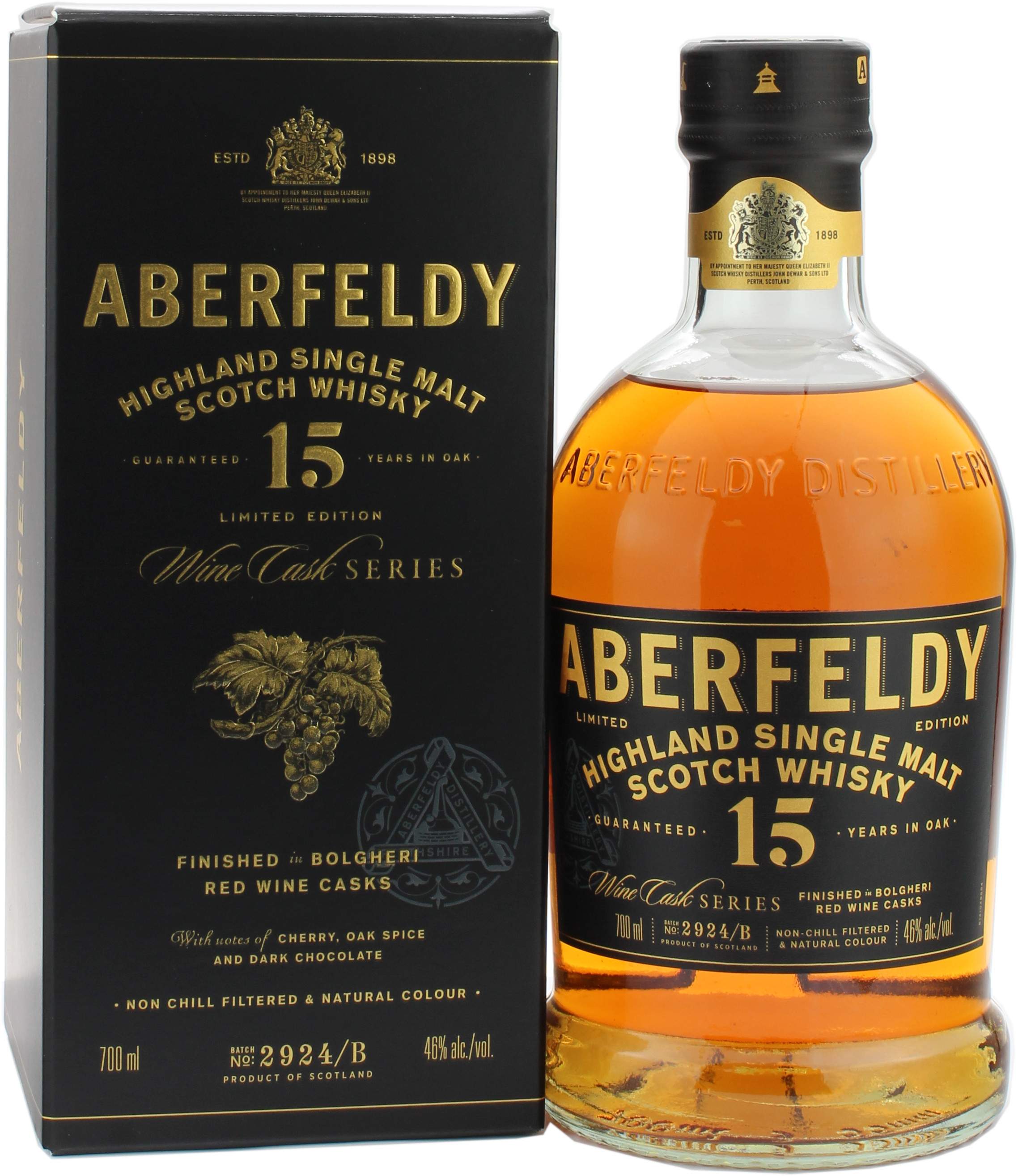 Der Aberfeldy Whisky ist berühmt für seinen honigsüßen Geschmack, der durch einen langen Fermentationsprozess entsteht. Diese limitierte Edition erhält mit dem speziellen Rotwein-Finish eine neue Geschmacksrichtung, ohne dass der ursprüngliche Charakter von ABERFELDY verloren geht. Nach einer 15-jährigen Lagerung in Refill- und Hogshead-Fässern wird der Aberfeldy 15 Jahre Tuscan Red Wine Cask Finish zusätzlich einige Zeit in toskanischen Bolgheri-Rotweinfässern gereift. Abgefüllt wurde der Aberfeldy 15 Jahre Tuscan Red Wine Cask Finish mit 46.0% vol.