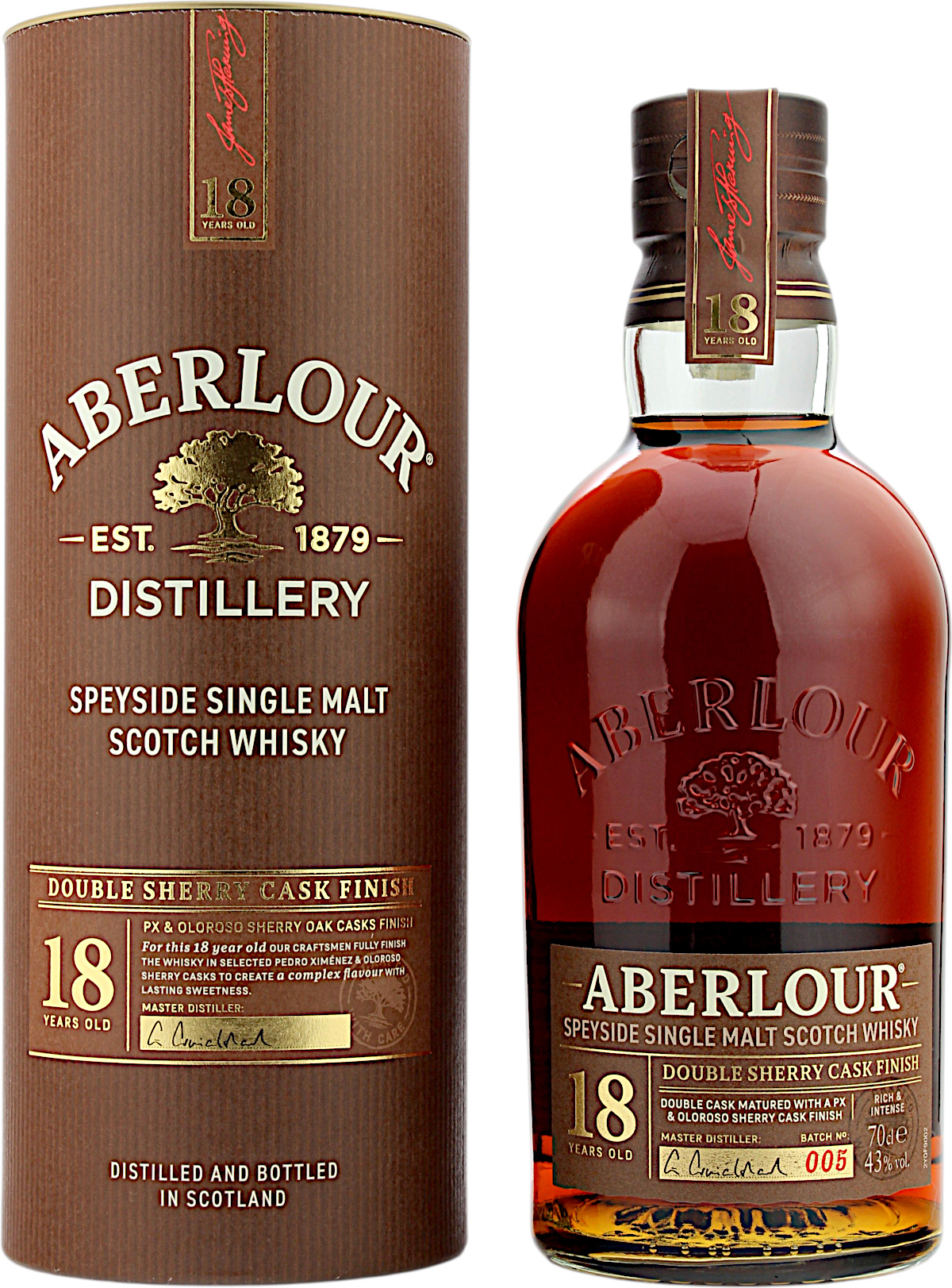 Der Aberlour 18 Jahre Double Sherry Cask Finish stammt aus der gleichnamigen Speyside Brennerei. Der Single Malt reifte zunächst in amerikanischer und europäischer Eiche. Anschließend erhielt er sein Finish in first fill Pedro Ximénez und Oloroso Sherry-Fässer. Durch die lange Reifung sind feine Aromen von süßen Sultaninen, Orangenzesten und Karamell entstanden. Abgefüllt wird der Aberlour 18 Jahre Double Sherry Cask Finish mit 43.0% vol.