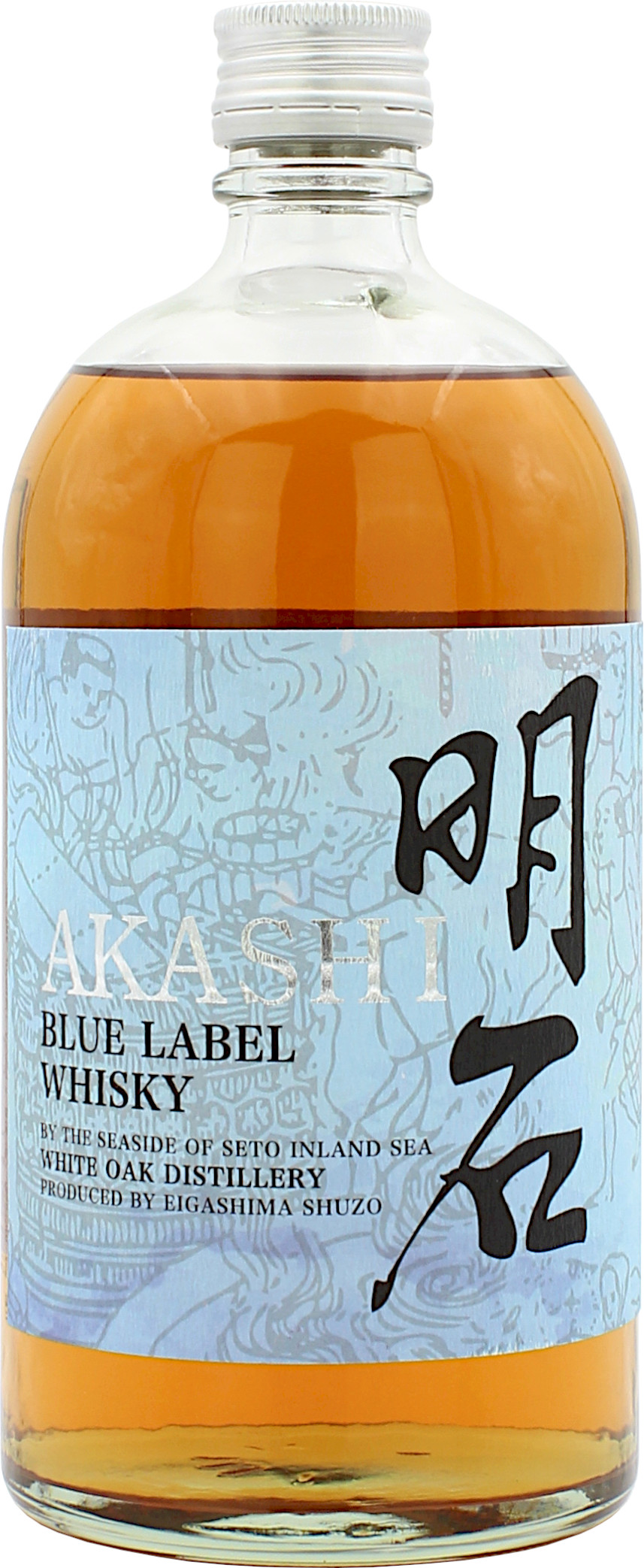 Der Akashi Blue Blended Whisky kommt aus der White Oak Destillerie und wird dort unter Aufsicht eines Sake Großmeisters "Toji" hergestellt. Bei der Destillation werden typisch schottische Pot-Stills verwendet, welche dem Akashi Whisky mehr Körper und Volumen verleihen. Die Lagerung des Akashi Blue wird zunächst in japanischen Shochu Sake Fässern durchgeführt. Im Anschluss folgt eine Ausbauphase in Ex-Bourbonfässern sowie ein 12 monatiges Finish in ehemaligen Sherryfässern. So entstand ein Whisky mit fruchtigen Aromen, Vanille und Nüssen. Im Geschmack zeigen sich frische Fruchtnoten, Walnüsse und etwas Rauch. Der Akashi Blue Blended Whisky wird mit 40.0% vol. abgefüllt.