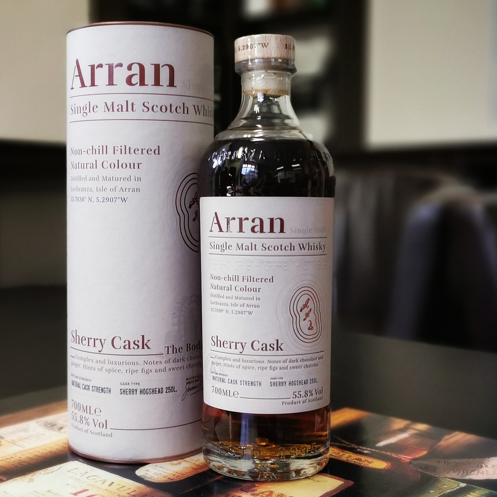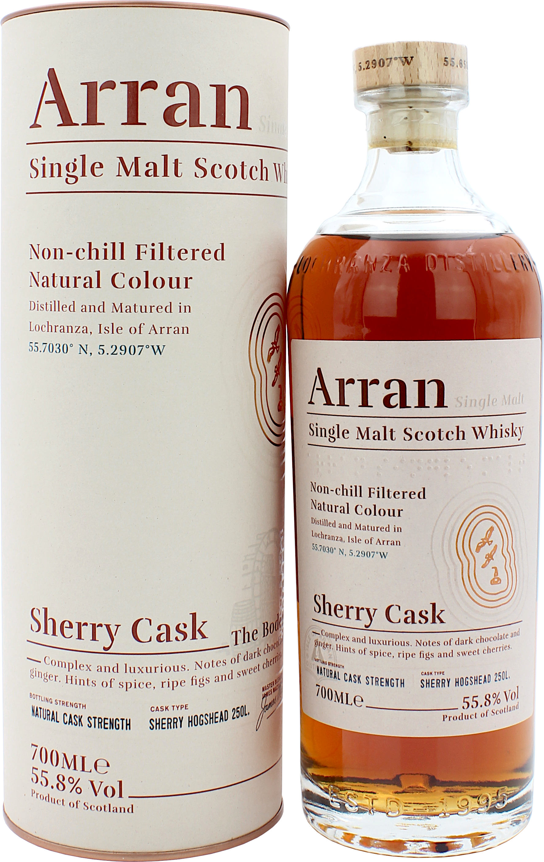 Der Arran Sherry Cask The Bodega Cask Strength ist ein Highlight der neuen Standard Range von Arran, die 2019 aufgelegt wurde. Die Lagerung erfolgte in aufgearbeiteten Sherry Hogsheads mit je 250 Liter. Diese sind aus amerikanischer Weißeiche und wurden als First Fill Fässer mit Arran Single Malt befüllt. Die Reifezeit wird nicht angegeben und auf einschlägigen Seiten findet man eine Angabe von ca. 7 Jahren. Der Arran Sherry Cask The Bodega Cask Strength wird mit Fassstärke und starken 55.8% vol. abgefüllt. Auf Kühlfiltrierung und Farbstoff wurde verzichtet.
