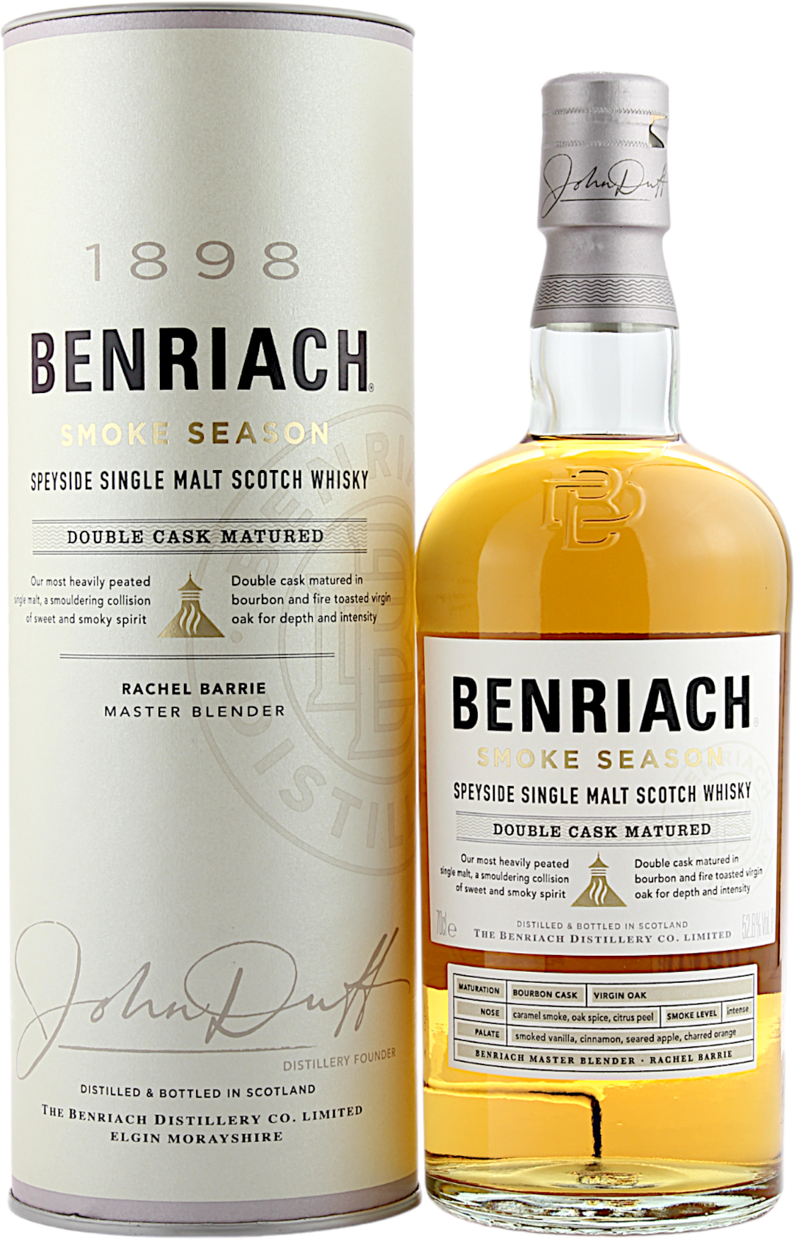 Der Benriach The Smokey Season Double Cask stammt aus der Speyside. Der Single Malt reifte in amerikanischen Virgin Oak und Bourbonfässern. Mit diesem Whisky erinnert Benriach an traditionelle Produktionstechniken. Zudem wurde hier Torf aus den Highlands verwendet. Abgefüllt wird der Benriach The Smokey Season Double Cask ohne Kältefiltrierung mit 52.8% vol.