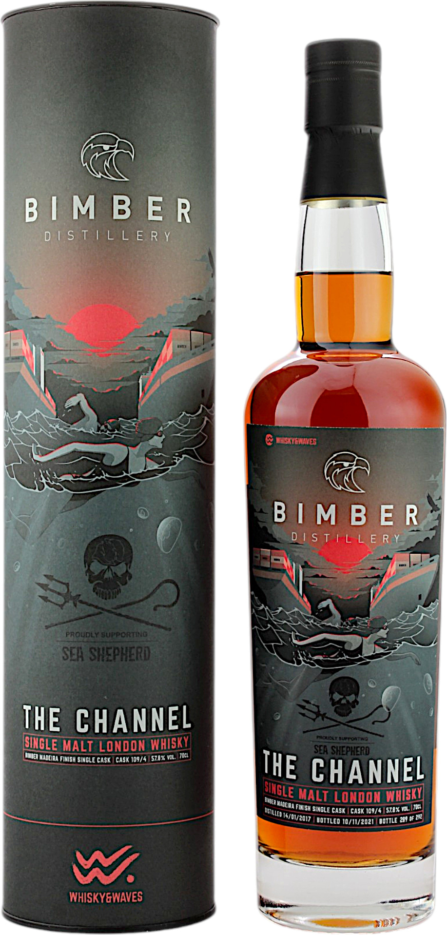 Der Bimber The Channel Sea Shepherd Single Cask 2021 ist eine limitierte Sonderabfüllung der gleichnamigen Brennerei und eine Kooperation mit Sea Shepherd. Der Bimber The Channel reiste im Gepäck der neuseeländischen Brüder Alex und Nick Ravenhall. Während sie von Dover nach Calais schwimmend den Ärmelkanal durchquerten. An Land angekommen, wurde der ursprünglich im Bourbonfass gereifte Whisky zurück ins Fass gefüllt und erhielt ein Finish im Madeira Fass mit der Cask 109/4. Seine Reifezeit erfolgte vom 14.01.2017 bis 10.11.2021. Die Abfüllung ist auf 292 einzeln nummerierte Flaschen limitiert und wurde ungefärbt und ungefiltert mit 57.8% vol. Fassstärke abgefüllt.