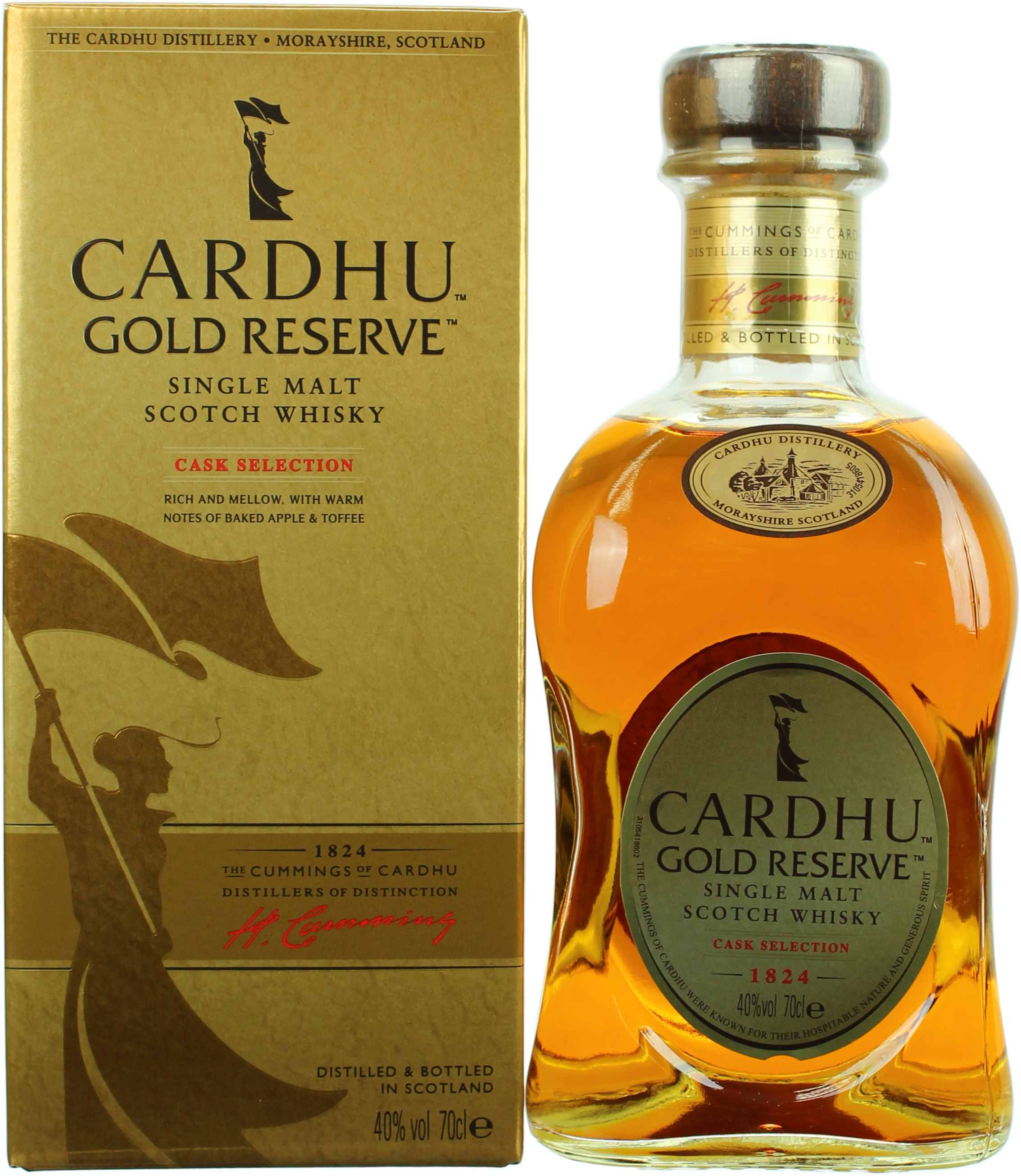 Seit 2015 ist der Cardhu Gold Reserve ein Teil des Hauptsortiments der Brennerei. Seine Lagerung findet in speziell ausgewählten getoasteten Eichenfässern statt, die ihm eine ausgeglichene Süße und Milde verleihen. Der Name 'Gold Reserve' bezieht sich auf die ansprechende goldene Farbgebung des Whiskys. Der Single Malt wird mit 40.0% vol. abgefüllt.