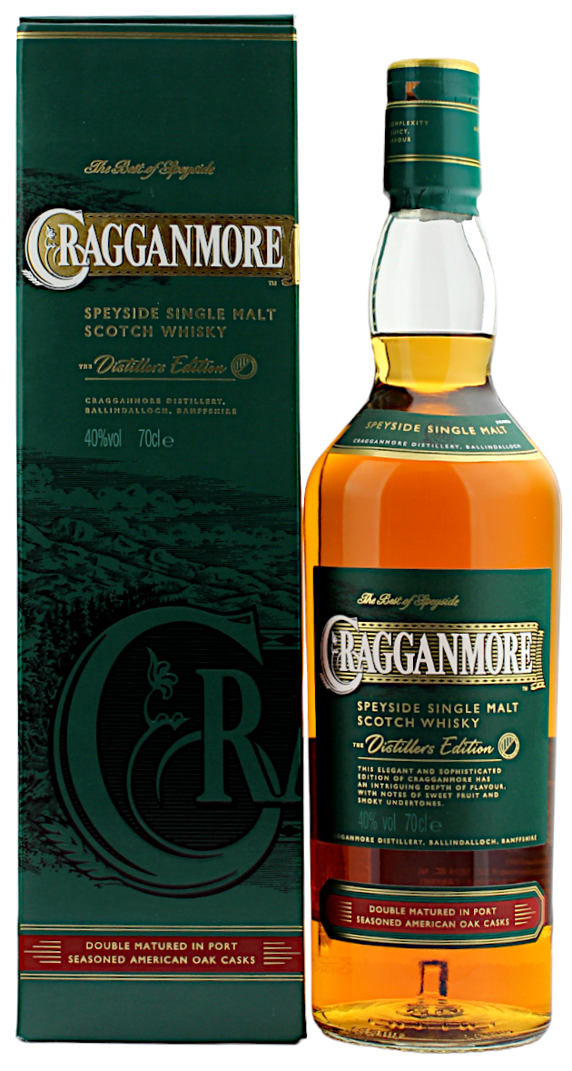 Jedes Jahr bringt Diageo von seinen Single Malts eine Distillers Edition auf den Markt. Diese erfahren eine zweite Reifung in ausgesuchten Fässern, die vorher mit hochprozentigen Weinen gefüllt waren. Die Cragganmore Distillers Edition lagerte zunächst in Refill Fässern aus amerikanischer Eiche. Anschließend erhielt der Single Malt eine zweite Reifung in abgelagerten Port- und geflammten Fässern aus amerikanischer Eiche. Dieses Finish in Portweinwässern ergänzt den Cragganmore perfekt und es entstand ein angenehm süßer, tief fruchtiger Single Malt mit eleganten Eichen- und Rauchnoten. Der Cragganmore Distillers Edition wird mit 40.0% vol. abgefüllt.