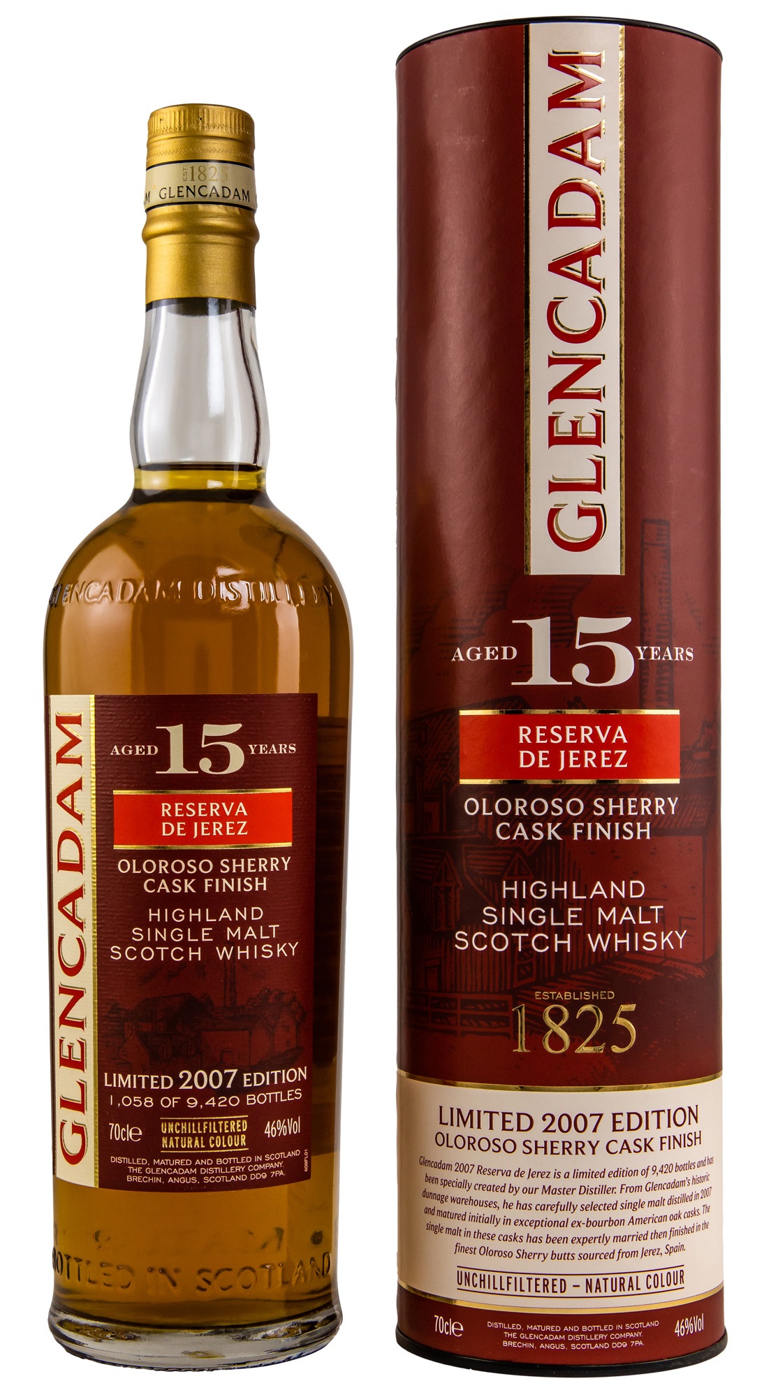 Der Glencadam 15 Jahre Reserva de Jerez Oloroso Sherry Cask stammt aus der gleichnamigen Brennerei, die auf eine lange Tradition zurückblickt. Noch heute werden bei der Produktion die gleichen Abläufe wie 1825 befolgt. Die Abfüllung ist auf 9.420 Flaschen stark limitiert. Jede Flasche ist einzeln nummeriert. Der Single Malt wurde 2007 destilliert und lagerte zunächst in Ex-Bourbonfässern. Im Anschluss erhielt der Glencadam ein Finish in Oloroso Sherryfässern. Der Glencadam 15 Jahre Reserva de Jerez Oloroso Sherry Cask wird nicht kühlgefiltert und nicht gefärbt. Abgefüllt wurde mit 46.0% vol.