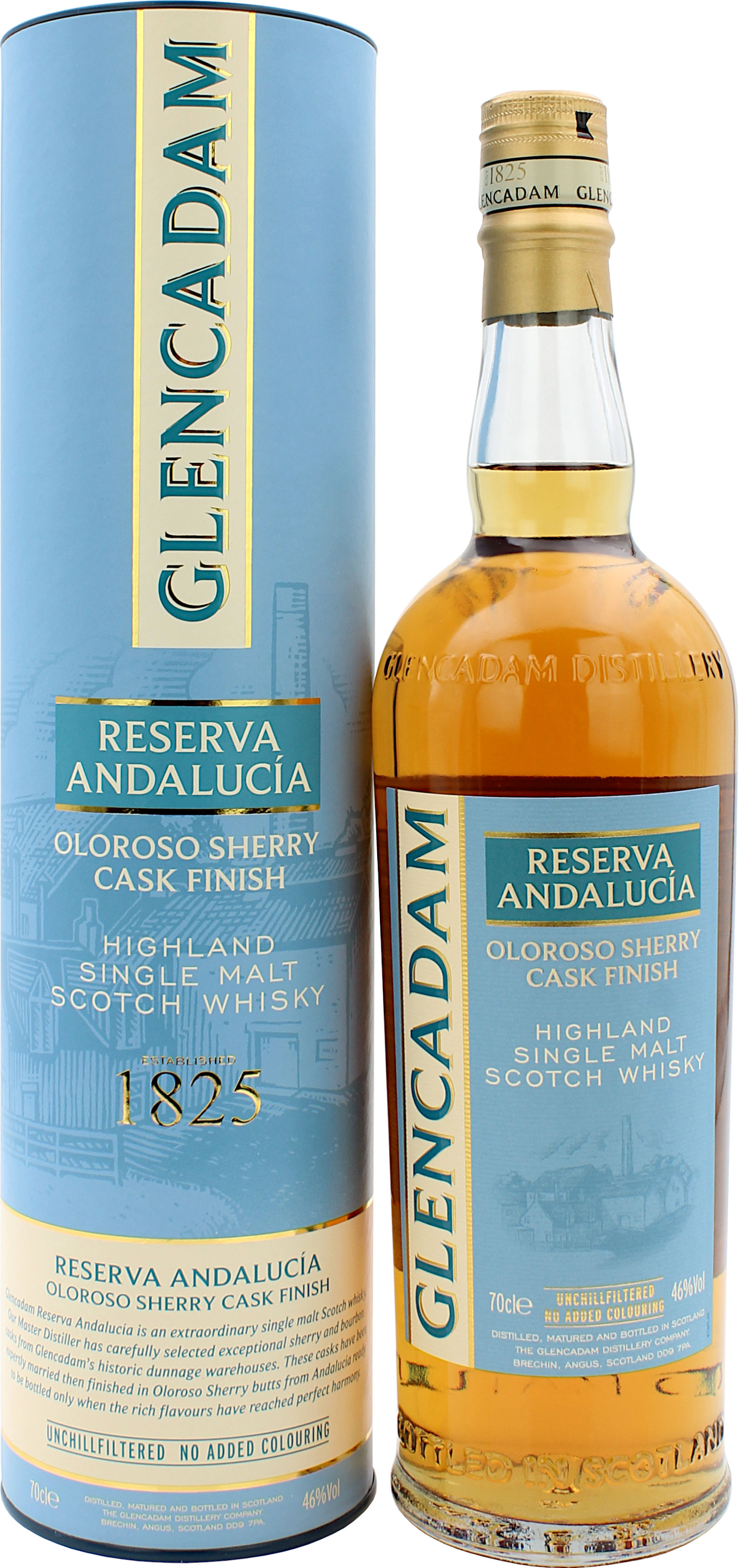 Der Glencadam Reserva Andalucia Oloroso Sherry Cask Finish ist eine Neuerung im Sortiment der Glencadam Brennerei und es ist nicht ganz klar, ob diese Abfüllung dauerhaft im Sortiment bleibt. Die Lagerung erfolgte zunächst in Ex-Bourbonfässern und ehemaligen Sherryfässern. Im Anschluss erhielt der Reserva Andalucia eine Vermählung und ein Finish in Oloroso Sherryfässern aus Andalusien. So entstand ein komplexer und fruchtiger Single Malt mit Aromen von reifen Früchten, Nougat und Vanille. Im Geschmack zeigen sich Noten von sahnigem Toffee, Gartenfrüchte und Bratäpfeln. Der Glencadam Reserva Andalucia Oloroso Sherry Cask Finsih wird ungefärbt und ungefiltert mit 46.0% vol. abgefüllt.