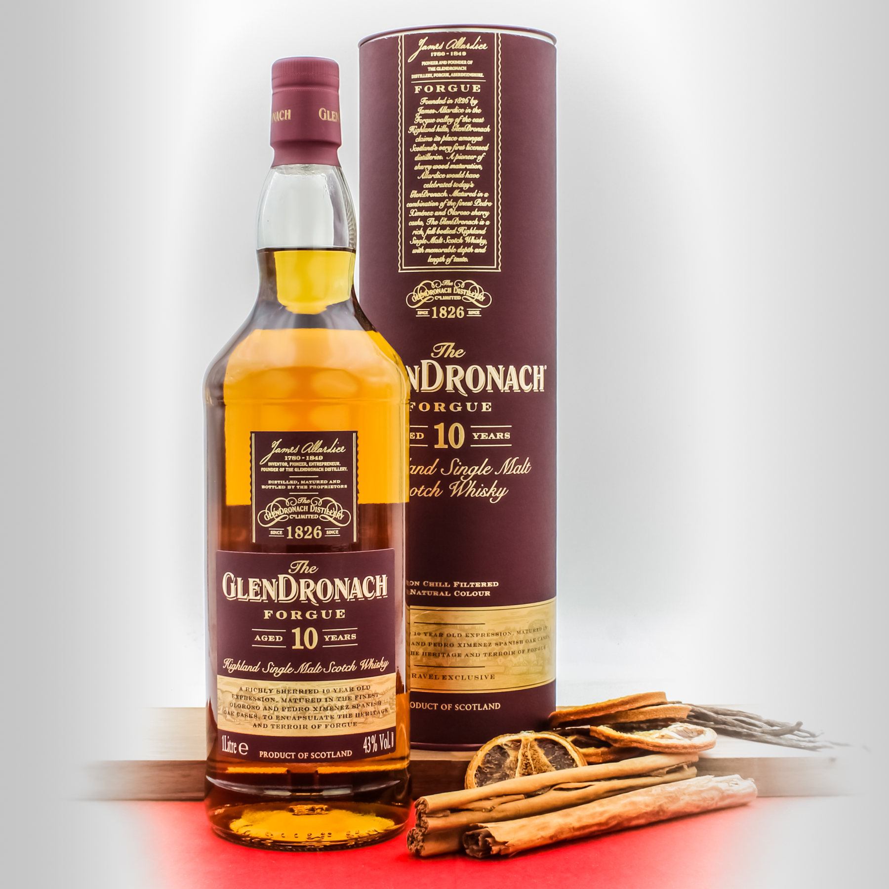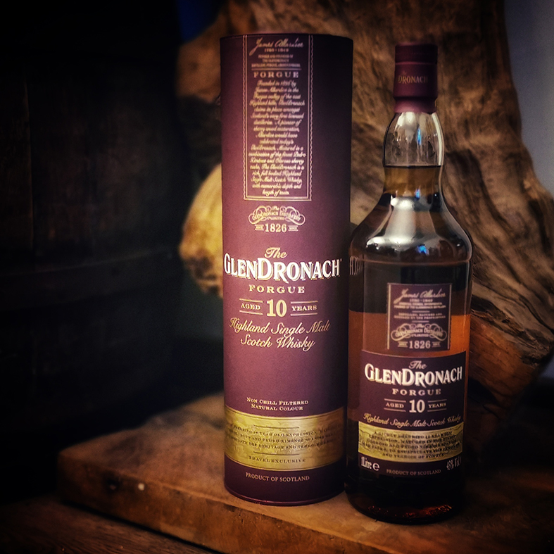 Der Glendronach 10 Jahre Forgue in der 1 Liter Flasche wurde für den Travel Retail Bereich aufgelegt und lagerte in spanischen Oloroso- und Pedro Ximenez Sherryfässern. Dadurch zeigt er fruchtige und würzige Aromen von Kirschen, Blutorangen und gerösteten Kastanien. Im Geschmack zeigt der Glendronach intensive Noten von Brombeeren, Karamellpralinen und Tabak. Der Glendronach 10 Jahre Forgue wird mit 43.0% ungefärbt und ungefiltert abgefüllt. Benannt wurde die Abfüllung nach dem Forgue Tal in dem die Glendronach Brennerei liegt.