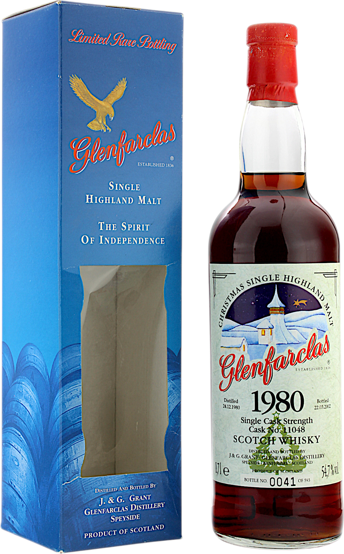 Jedes Jahr bringt Glenfarclas zum Jahresende ihre berühmten Christmas Malts heraus. Am 22.03.2002 wurde ein ehemaliges Sherry Einzelfass mit der Nummer 11048 abgefüllt, welches am Heiligen Abend 1980 destilliert wurde. Die Flaschenanzahl war damals auf 593 Stück limitiert. Zum Verkauf steht die Flasche 0041. Abgefüllt wurde mit 54.7% vol. Fassstärke und auf Kühlfiltrierung und Färbung wurde verzichtet. Das Alter der Abfüllung beträgt 21 Jahre. Die Umverpackung weist Gebrauchsspuren auf.