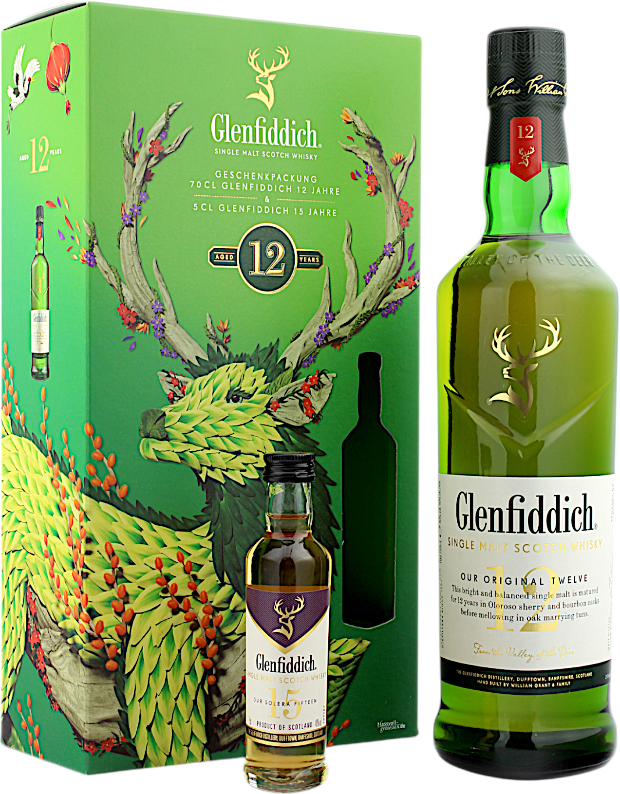 Der Glenfiddich 12 Jahre in einem edlen Geschenkset mit einer Miniatur Glenfiddich 15 Jahre mit 50ml.