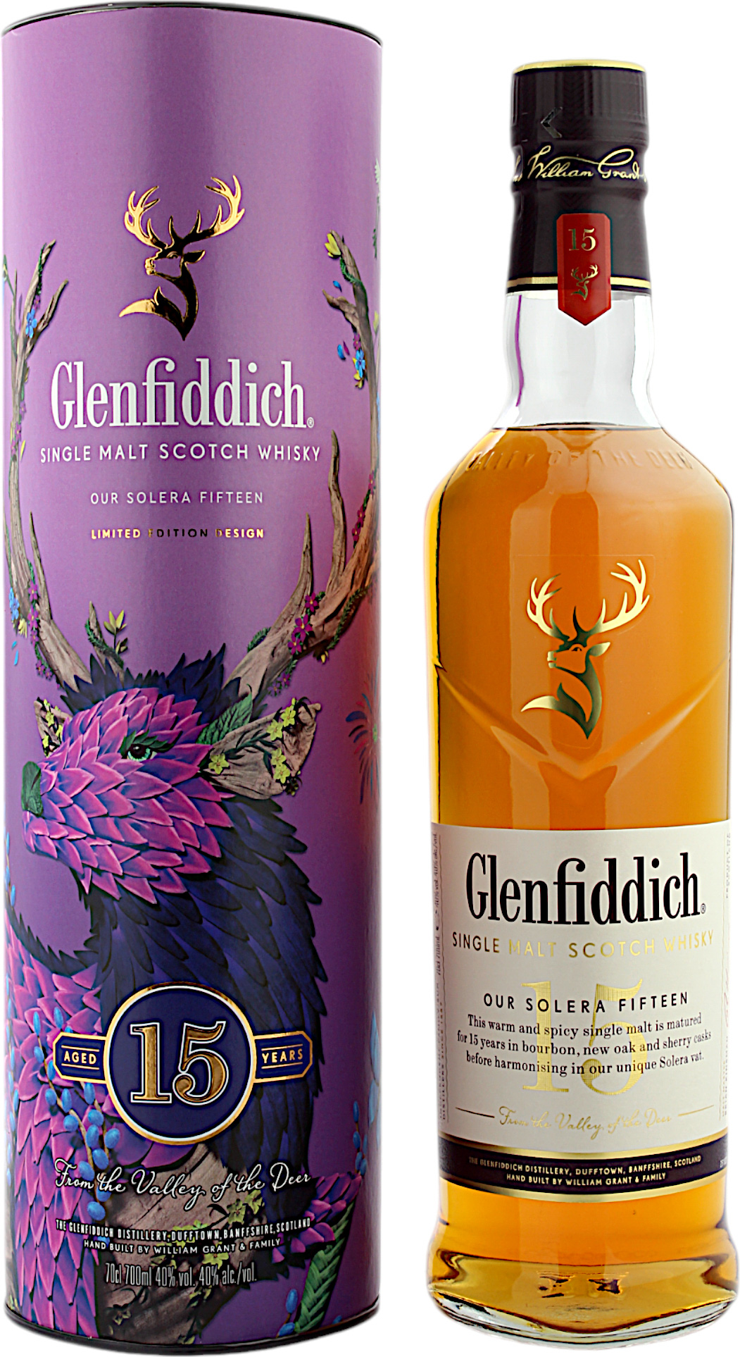 Glenfiddich, bei Dufftown in der Shottischen Speyside, ist eine der letzten (wirklich großen) Destillerien, die sich bis dato, immer noch in Familienbesitz befindet. Seit Ihrer Gründung in 1886 gehört die Brennerei bereits in der fünften Generation der Familie Grant. Von Anfang an wird der Whisky mit Quellwasser aus der Robbie-Dhu-Quelle hergestellt. Heute ist Glenfiddich die einzige Destillerie, die für alle Prozessschritte frisches Wasser aus ein und derselben Quelle verwendet. Der Titel 'Our Solera Fifteen' unterstreicht die Besonderheit des in der Brennerei angewendeten Solera-Verfahrens. Auf das Flaschendesign wurde die Herkunft stilistisch übertragen: Die V-Gravierung auf der Flasche steht bildhaft für das 'Valley of the Deer' (Tal der Hirsche, gälisch Glenfiddich), dem Herkunftsort der Brennerei.