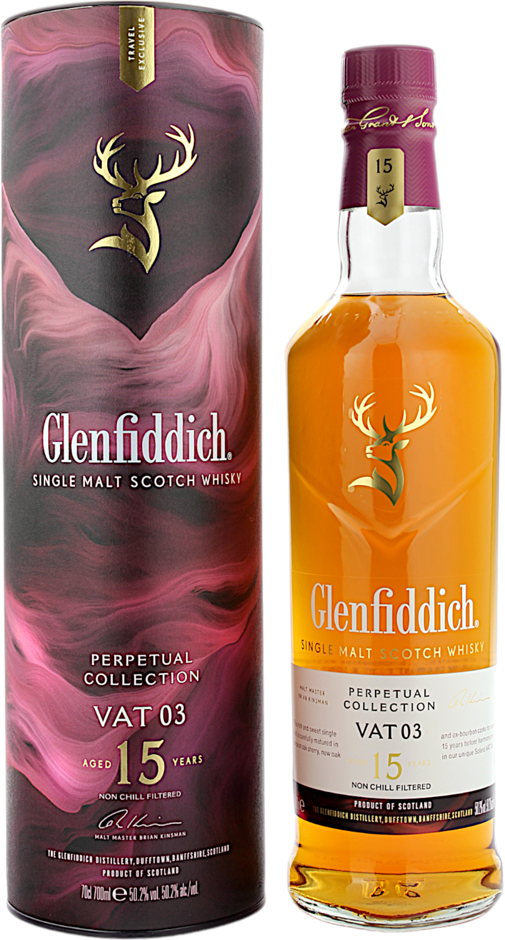 Der Glenfiddich 15 Jahre Perpetual VAT 03 ist Teil der Perpetual Collection. Hier wird Whisky hergestellt, der aus Solera_Fässern stammt, die nie geleert, sondern immer wieder mindestens zur Hälfte mit Glenfiddich-Whisky aufgefüllt werden. In diesem Fall aus dem Solera Fass 03. Für dieses Fass gilt, dass das Mindestalter des Whiskys mindestens 15 Jahre beträgt. Dank des kontinuierlichen Blendings und der ständigen Bewegung vereint der Single Malt Schichten von süßen und würzigen Noten auf einzigartige Weise. Abgefüllt wurde der Glenfiddich 15 Jahre Perpetual VAT 03 mit 50.2% vol.