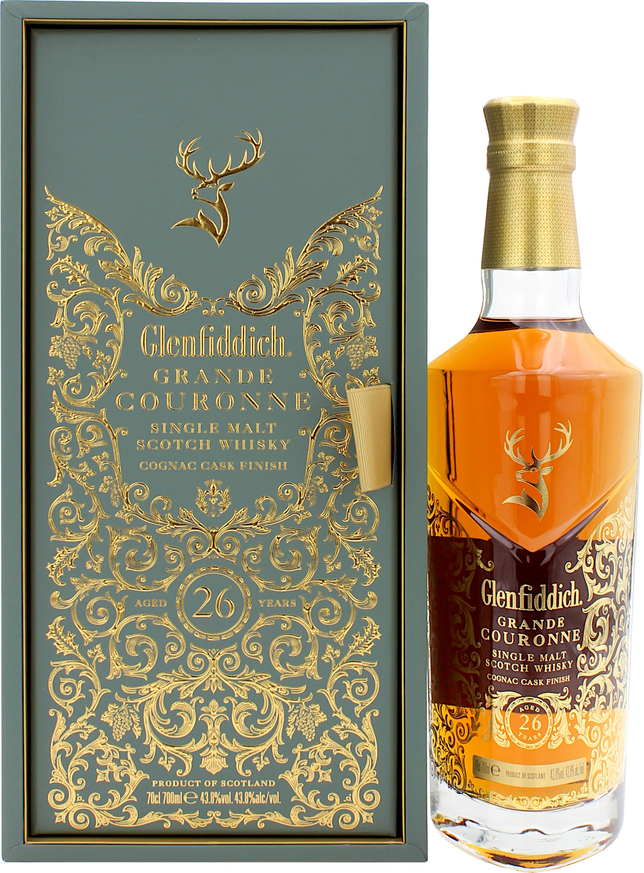 Der Glenfiddich 26 Jahre Grande Couronne ist ein 26-jähriger Single Malt, der für 2 Jahre in ehemaligen Cognacfässern gefinisht wurde. Zuvor wurde der Whisky in europäischen und amerikanischen Eichenfässern ausgebaut. Der Glenfiddich 26 Jahre Grande Couronne ist der dritte Whisky, der in der sogenannten „Grand“-Serie veröffentlicht wurde. Abgefüllt ist der Whisky mit 43.8% Alkoholstärke und die Auflage ist auf 5.000 Flaschen weltweit limitiert.