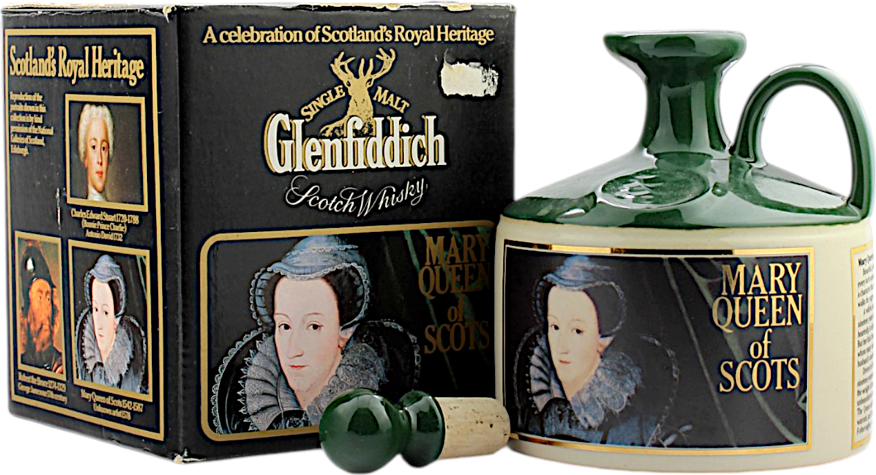 Der Glenfiddich Decanter Mary Queen of Scots wird in einem alten Decanter Keramik Krug sowie einer Umverpackung verkauft. Die Umverpackung weist normale Gebrauchsspuren auf. Die Abfüllung stammt aus den 1970-1980 Jahren und wurde für die Serie "Scotland's Royal Heritage" aufgelegt. Die Abfüllung in der 750ml Flasche ist für den italienischen Markt gedacht gewesen. Auf der Umverpackung und dem Decanter ist das Bild von Mary Queen of Scots. Die Umverpackung weist deutliche Gebrauchsspuren auf.