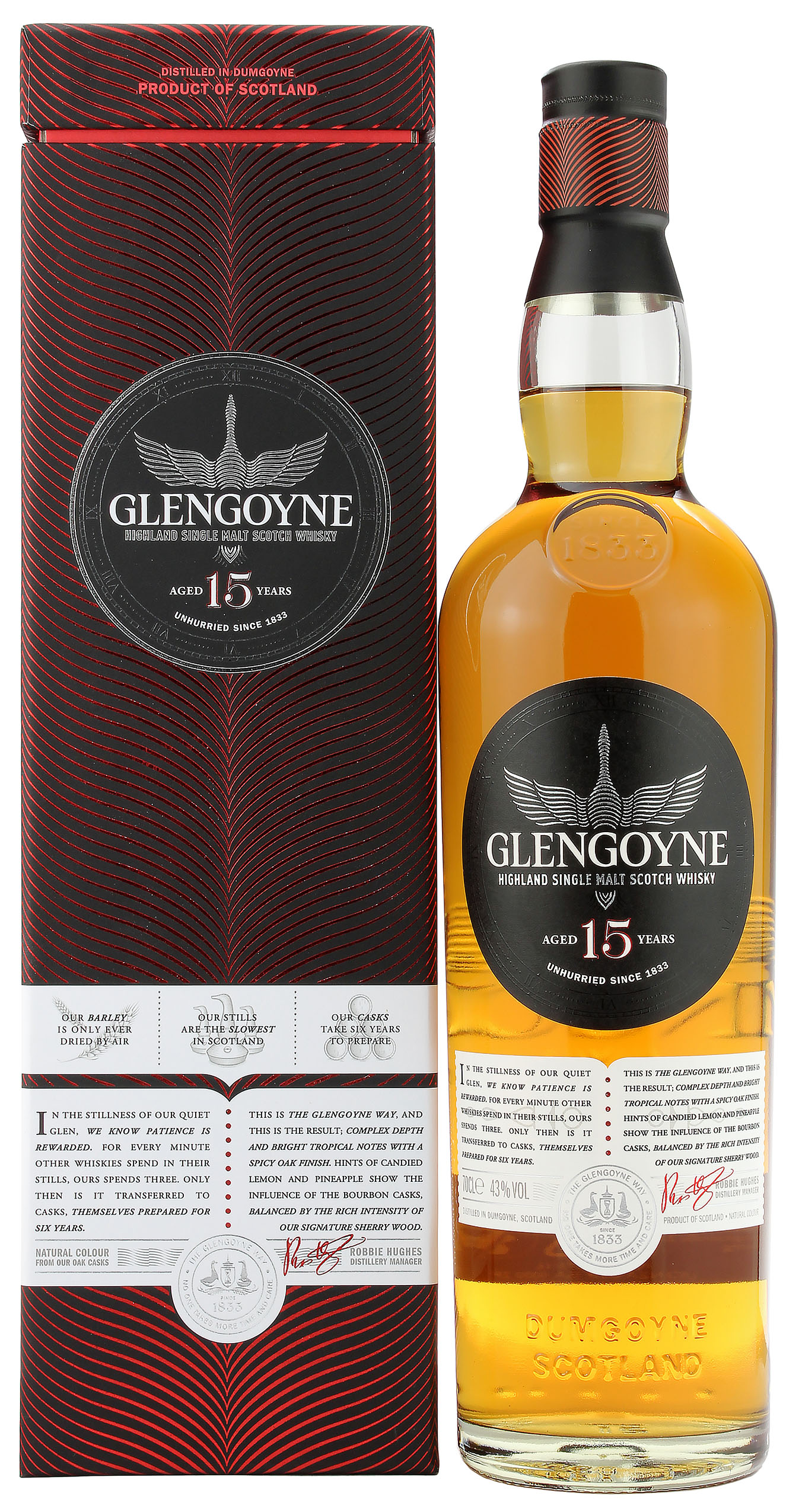 Der Glengoyne 15 Jahre in der Neuauflage 2022 besticht durch sein komplex süßes und abgerundetes Aroma. Der Geschmack von dunklen, roten Früchten und würzige Eiche sind das Ergebnis der Mischung von Bourbon Casks und First Fill Sherry Casks. Die Gerste wird luftgetrocknet, ohne Torfrauch. Glengoyne ist bekannt für eine sehr langsame und sorgfältige Destillation. Dadurch erreicht er seinen ausgeglichenen, tiefen Charakter. Abgefüllt wird der Glengoyne 15 Jahre ungefärbt mit 43.0% vol.