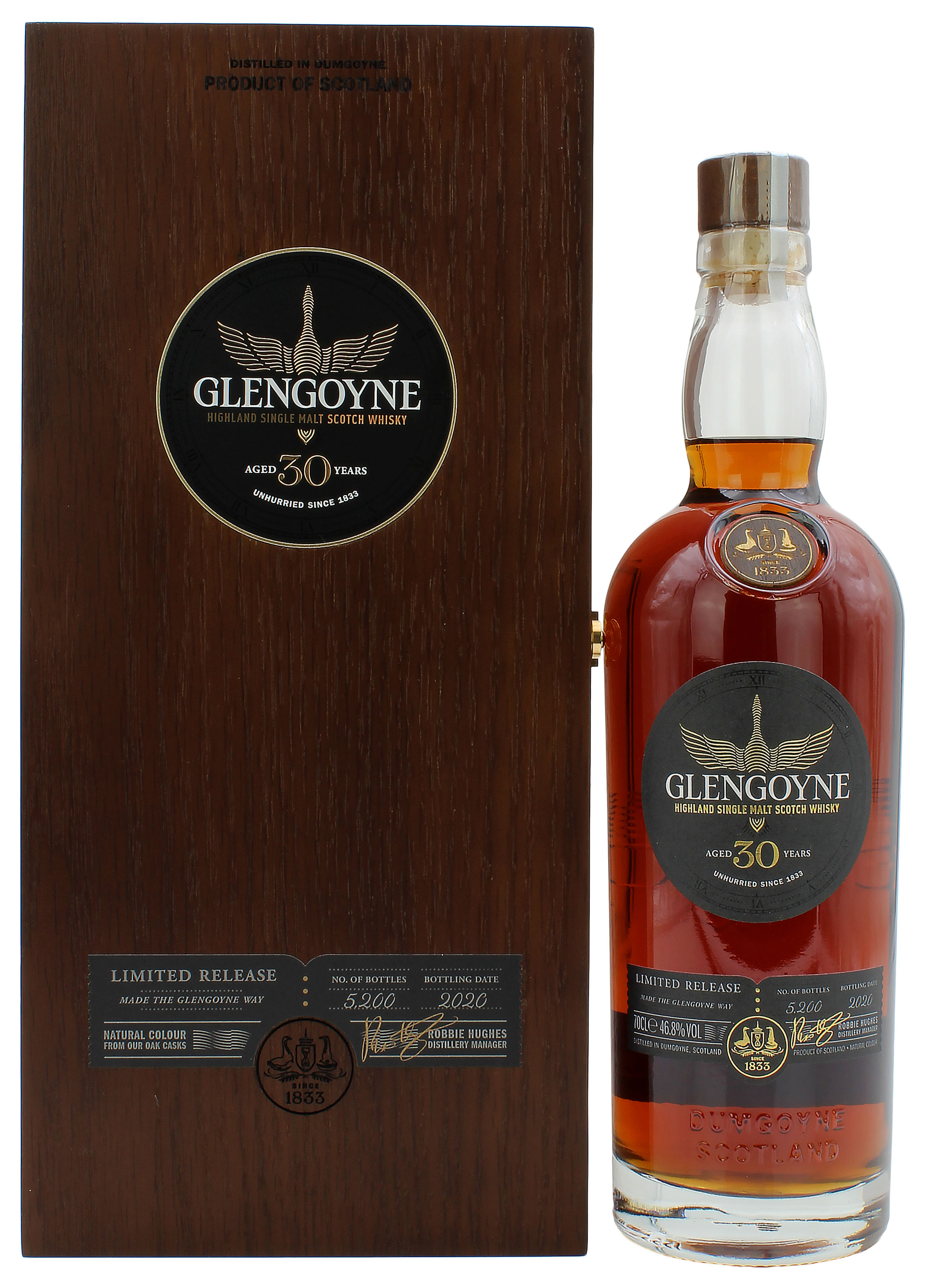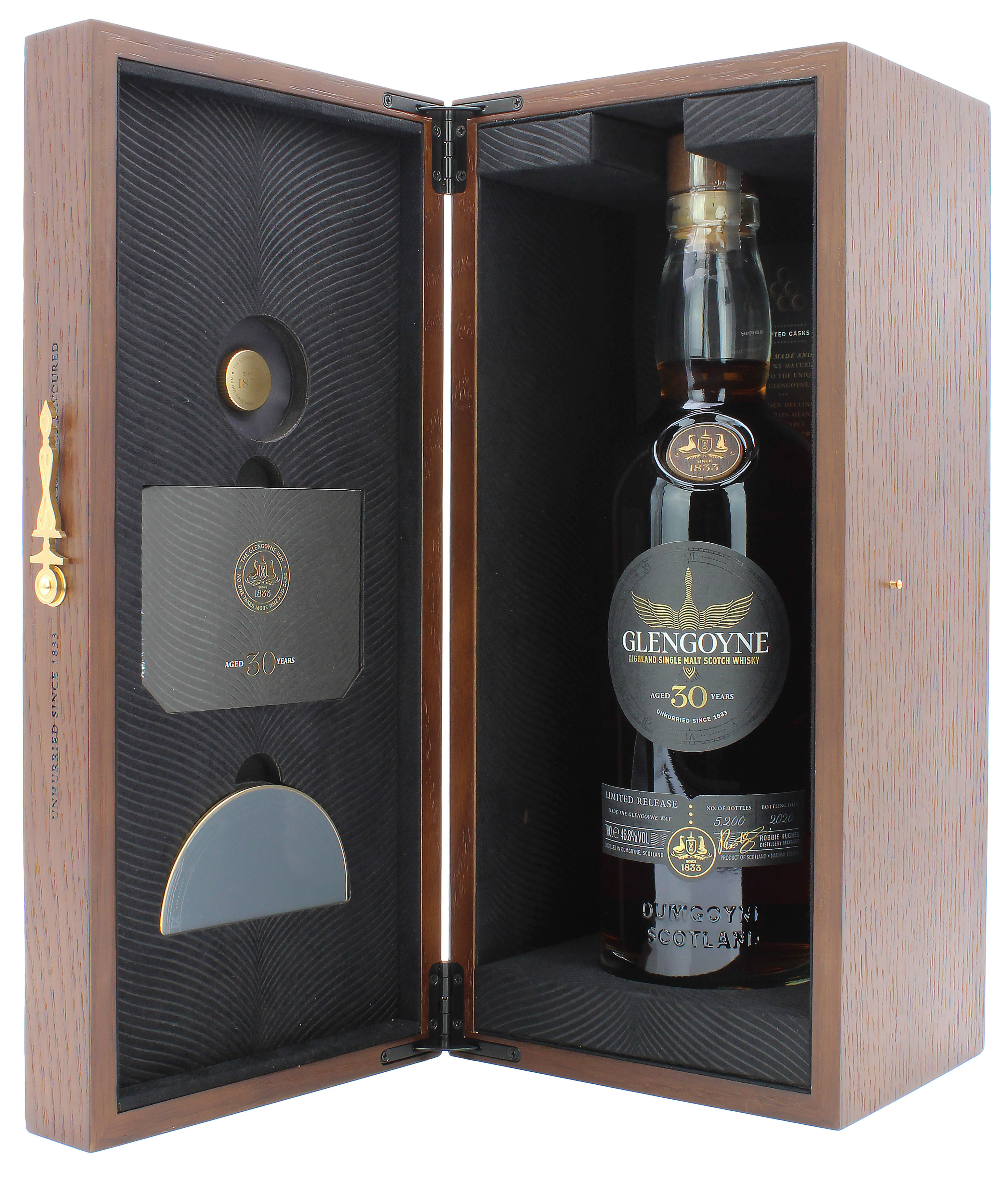 Der Glengoyne 30 Jahre Sherry Cask besteht aus einem Vatting von 13 Sherry-Fässern, die zu zwei Dritteln aus Refill-Sherry-Fässern und einem Drittel aus europäischen First-Fill-Sherry-Fässern bestehen. Durch diese Fässer entsteht die Farbe und der intensive Sherrygeschmack. Seit 2020 erstrahlt der Single Malt in einem neuen Design. Der Whisky ist auf 5.200 Flaschen limitiert und wurde mit 46.8% vol. abgefüllt.