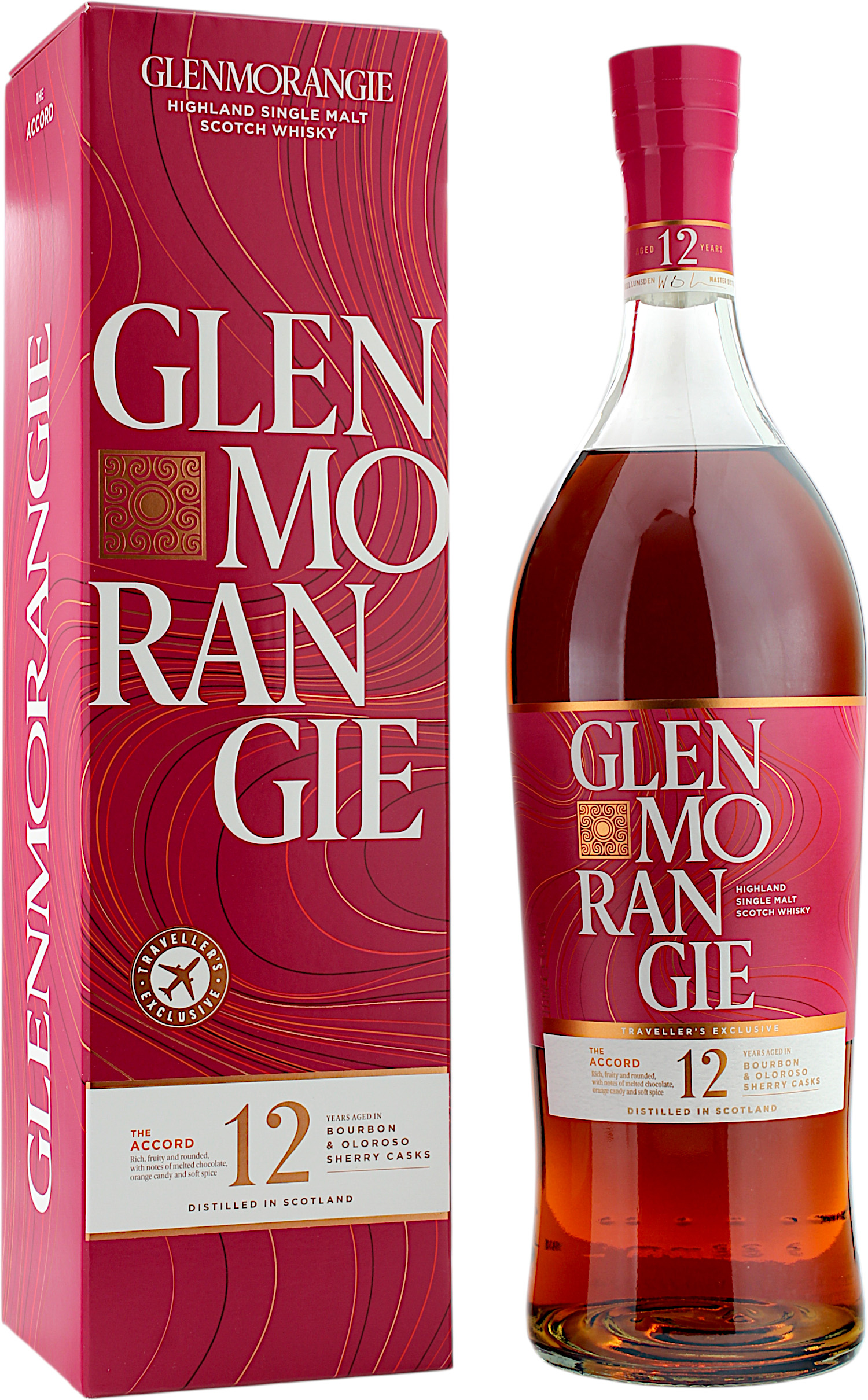 Der Glenmorangie 12 Jahre The Accord gehört zu der Serie "Exclusive Core Expressions" von Glenmorangie. Die Serie wurde speziell für den Duty-free-Shop abgefüllt und ist jetzt auch in Deutschland erhältlich. Der Glenmorangie 12 Jahre The Accord zeigt das Know-how der Glenmorangie Distillerie bei der Verheiratung von Fässern. Die Reifung erfolgte in ehemaligen amerikanischen Bourbon-Eichenfässern, welche dem Single Malt milde und fruchtige Noten verleiht und in ausgewählten Oloroso Sherry-Fässer, welche die Süße und Würze beisteuern. Durch die Vereinigung entstehen Aromen von Toffee, Vanille und Orangen. Im Geschmack zeigen sich Noten von kandierten Früchten, Pflaumen und braunem Zucker. Abgefüllt wurde der Glenmorangie 12 Jahre The Accord in der 1 Liter Flasche mit 43.0% vol.