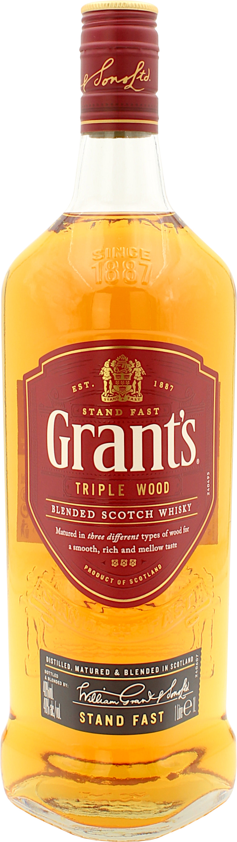 Der Grant's Triple Wood ist einer der bekanntesten Blended Scotch Whiskys der Welt und wurde bereits im Jahr 1898 von seinem Namensgeber William Grant auf den Markt gebracht. Seine hervorragenden Aromen verdankt er 3 verschiedenen Fassarten in denen der Whisky reifte. Die Virgin Oak-Fässer bringen die Würze, die American Oak-Fässer sorgen für feine Vanillenoten, während die Ex-Bourbon-Fässer den komplexen Geschmack abrunden. Für die Vermählung zu Grant's werden ca. 25 verschiedene Malt und Grain Whiskys herangezogen. Die Basis ist hier ein Grain Whisky aus der Brennerei Girvan, welcher im aufwendigen Vakuumdestillationsverfahren hergestellt wurde. Der Grant's Triple Wood wird mit angenehmen 40.0% vol. in die Flasche gefüllt.