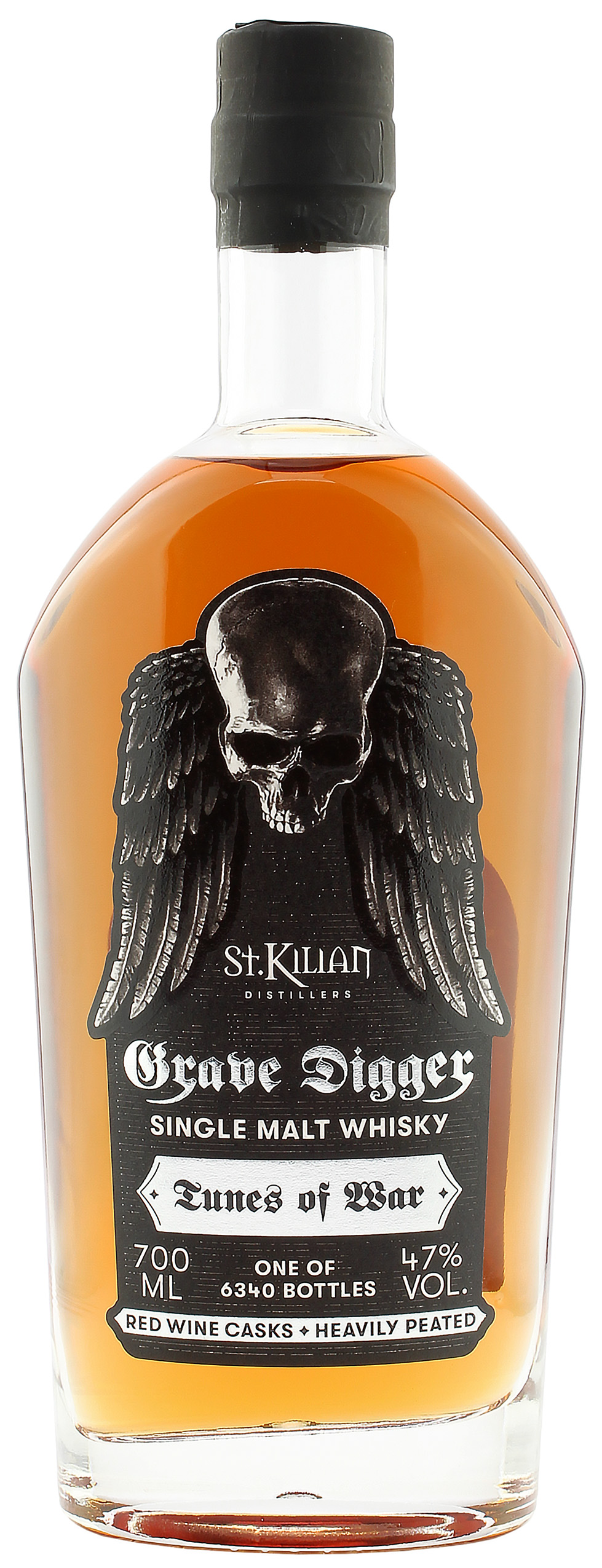 Die streng limitierte Heavy Metal Edition „Tunes of War“ reifte über 3 Jahre in 225 Liter Ex-Rotwein Fässern. Das Heavily Peated Gerstenmalz mit 54ppm stammt aus den schottischen Highlands und verkörpert Heavy Metal in Reinform. Das Ergebnis ist eine einzigartig cremig-süße Melange aus roten Trauben, reifen Äpfeln und saftigen Pfirsichen mit wärmendem Torfrauch. Abgefüllt wird der Whisky mit 47.0% vol. Der Grave Digger Tunes of War Heavily Peated Single Malt ist auf 6.430 Flaschen limitiert. Auf Kühlfiltrierung und Farbstoff wurde verzichtet.
