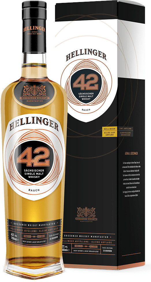 Der Hellinger 42 Rauch Single Malt Whisky stammt von der Dresdner Whisky Manufaktur UG. Dieser reifte für 9 Jahre in amerikanischen Ex-Bourbonfässern. Dieser Whisky ist geprägt von kühlen Raucharomen ohne medizinischen Noten, die sich angenehm und geradlinig zeigen. Sämtliche Zutaten stammen aus der Nähe der Manufaktur und sorgen dafür, dass dieser Single Malt ein echter Sachse ist. Abgefüllt wird der Hellinger 42 Rauch Single Malt Whisky mit 46.0% vol. Auf Kältefiltrierung und Färbung wurde verzichtet.