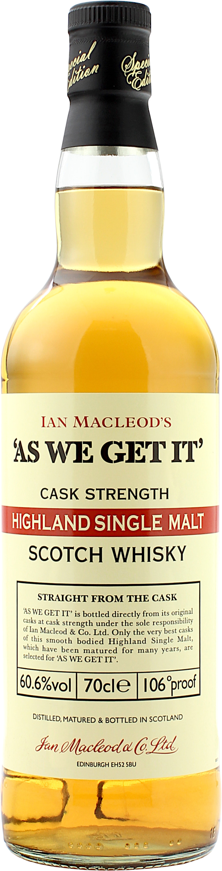 Vom unabhängigen Abfüller Ian Macleod kommt die Abfüllung mit dem ungewöhnlichen Namen "As We Get It". Im übertragenem Sinne heißt es, dass dieser Single Malt direkt vom Fass kommt und nicht weiter verdünnt abgefüllt wird. Daher auch die starken 60.5% vol. Fassstärke. Der Single Malt trägt keine Altersangabe und es weißt nur der Beiname "Highland Single Malt" auf seinen Charakter hin. Diese Abfüllung stammt aus einer geheimen Highland Brennerei und die Lagerung erfolgte in Eichenfässern. Das Aroma und der Geschmack zeigt Noten von Feigen, Aprikosen, Vanille und Schokolade. Sehr gelungene und in Schottland sehr beliebte Serie. Der Ian Macleod's - As We Get It- wird nicht kühlgefiltert und nicht gefärbt.