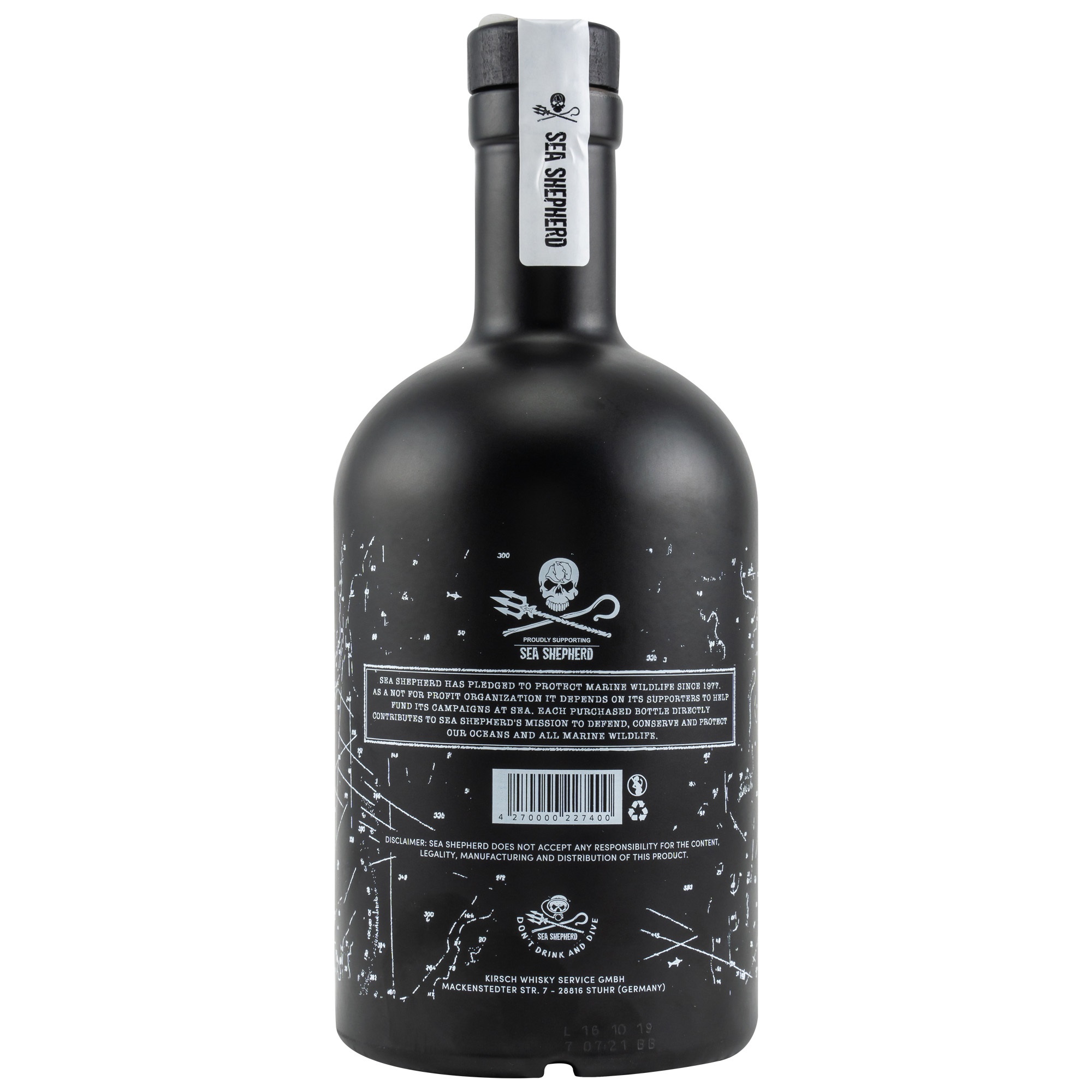 In Zusammenarbeit mit der Meeresschutzorganisation Sea Shepherd präsentiert der deutsche Importeur Kirsch Whisky eine Islay Single Malt Abfüllung. Die Ausgangsbrennerei wird nicht genannt, spiegelt aber den maritimen, rauchigen und rauen Grundcharakter der Insel Islay wieder. Sea Shepherd setzt sich dafür ein die maritime Tierwelt zu schützen. Dabei ist die Non-Profit Organisation auf Spenden angewiesen. Von dem Verkauf des Islay Single Malt Sea Shepherd geht ein Anteil direkt an die Organisation. Der Islay Single Malt Sea Shepherd wird mit 43.0% vol. abgefüllt. Die Abfüllung fällt verhältnismäßig dunkel aus und es könnte auch ein gewisser Anteil in Sherry gelagert sein.