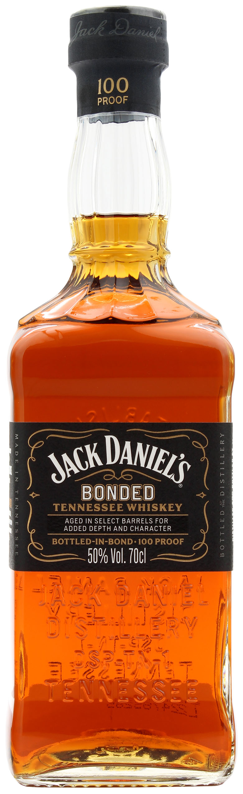 Der Jack Daniel's Bonded Tennessee Whiskey gehört zum neuen Premium Segment der Marke und erfüllt die Kriterien des Bottled-In-Bond Act von 1897. Hergestellt wird der Tennessee Whiskey zu 8 % aus Roggen, 12 % gemälzter Gerste und 80 % aus Mais. Seine Reifung verbrachte der Bonded in einer handverlesenen Auswahl besonderer Fässer für mindestens 4 Jahre in einem staatlich überwachten Lagerhaus. Im Aroma zeigen sich eine Eichenholzaromen, Karamell und Gewürze. Im Geschmack begeistert der Jack Daniel's Bonded vollmundig und kräftig, mit vielschichtigen Noten von Karamell, Holzkohle und würzige Eiche. Abgefüllt wird der Jack Daniel's Bonded Tennessee Whiskey mit 50.0 %. vol. Das gelungene Flaschendesign orientiert sich am Originaldesign der Jack Daniel's Tennessee Whiskey-Flasche von 1895.