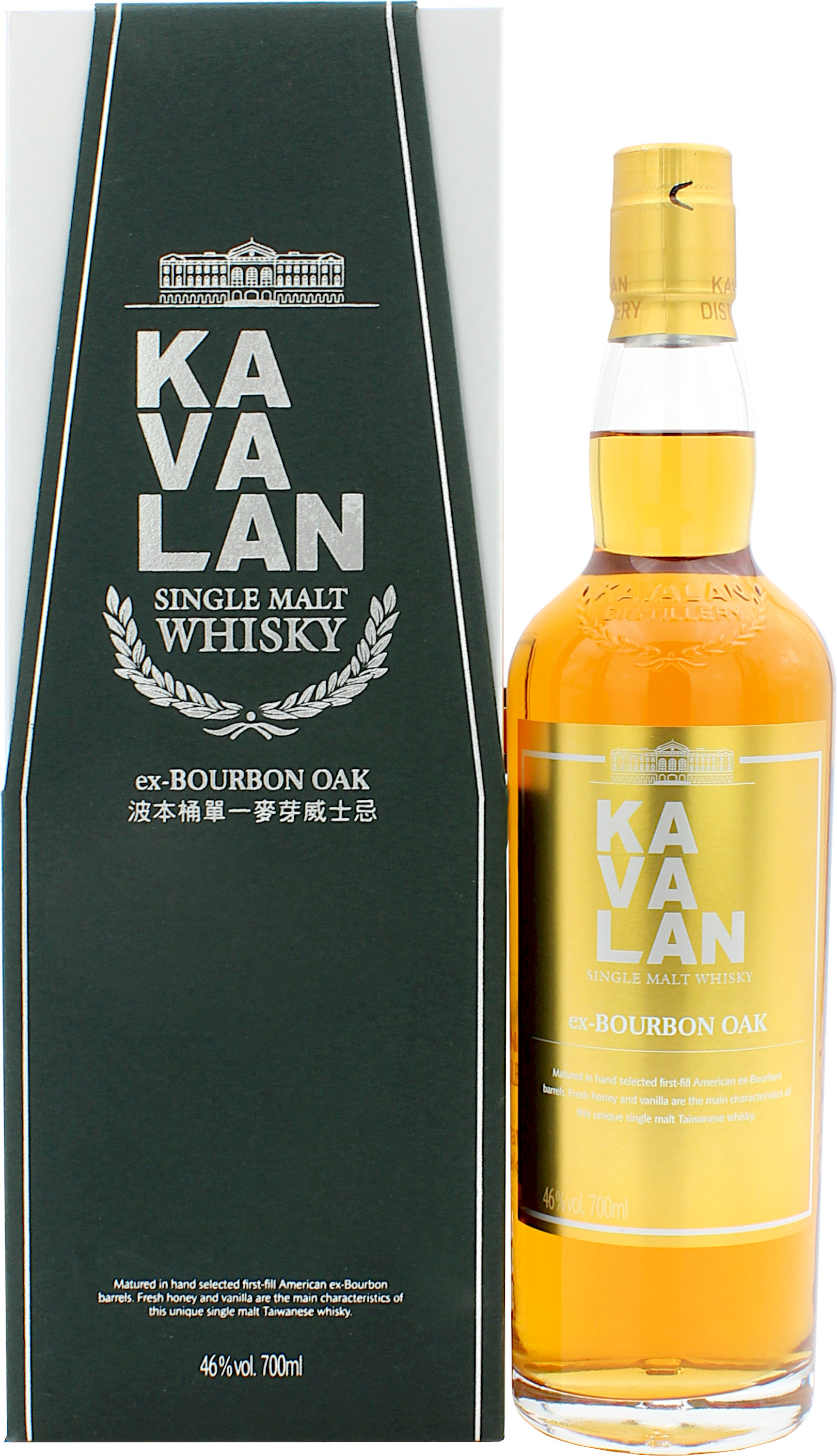 Der Kavalan Ex-Bourbon Oak kommt aus der 2005 erbauten Kavalan Brennerei in Taiwan. Dieser Single Malt ist der Grund für viele Auszeichnungen und eine enorme Nachfrage nach den Abfüllungen der Brennerei. Der Kavalan Ex-Bourbon Oak ist das Bindeglied zwischen dem Standard Single Malt und den Solist-Abfüllungen. Die Reifung erfolgte in besten First Fill Ex-Bourbon Barrels. Die Abfüllung erfolgt dann in verschiedenen Batches aus einer größeren Anzahl ausgesuchter Fässer im Altersbereich 4-6 Jahre. Der Kavalan Ex-Bourbon Oak wird nicht kühlgefiltet, ist ungefärbt und kommt mit 46.0% vol. in die Flasche.