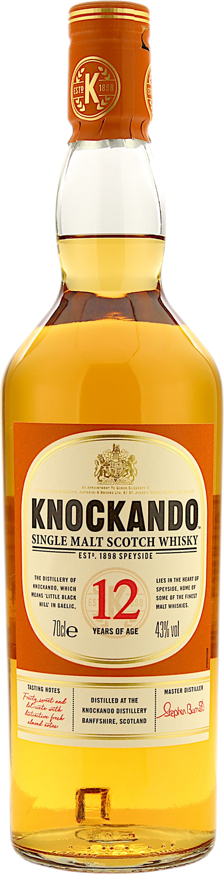 Der Knockando 12 Jahre ist ein Klassiker aus dem Hause Knockando. Die Knockando-Brennerei wurde 1898 von John Thompson im gleichnamigen Dorf in direkter Nähe des Flusses Spey erbaut. Das Wort „Knockando“ leitet sich vom gälischen Wort „Cnoc-an-dhu“ ab und bedeutet übersetzt „Kleiner schwarzer Hügel“. Die Brennerei wurde während des viktorianischen Whisky-Booms 1898 gegründet. Sie geriet jedoch mit zwielichtigen Händlern in Konflikt, sodass sie 1899, nach nur einem Produktionsjahr, wieder geschlossen wurde. Bald darauf übernahm W & A Gilbey die Brennerei, was für diese und die Whiskyliebhaber auf der ganzen Welt eine glückliche Wendung bedeutete. Erst ab dieser Zeit erholte sich die Brennerei von dem Debakel der ersten Jahre und langsam begann der Aufschwung. Heute gehört Knockando nach verschiedenen Besitzerwechseln zu Diageo und erreicht mit insgesamt vier Stills ein Jahresvolumen von etwa 1,5 Millionen Liter Rohbrand pro Jahr.