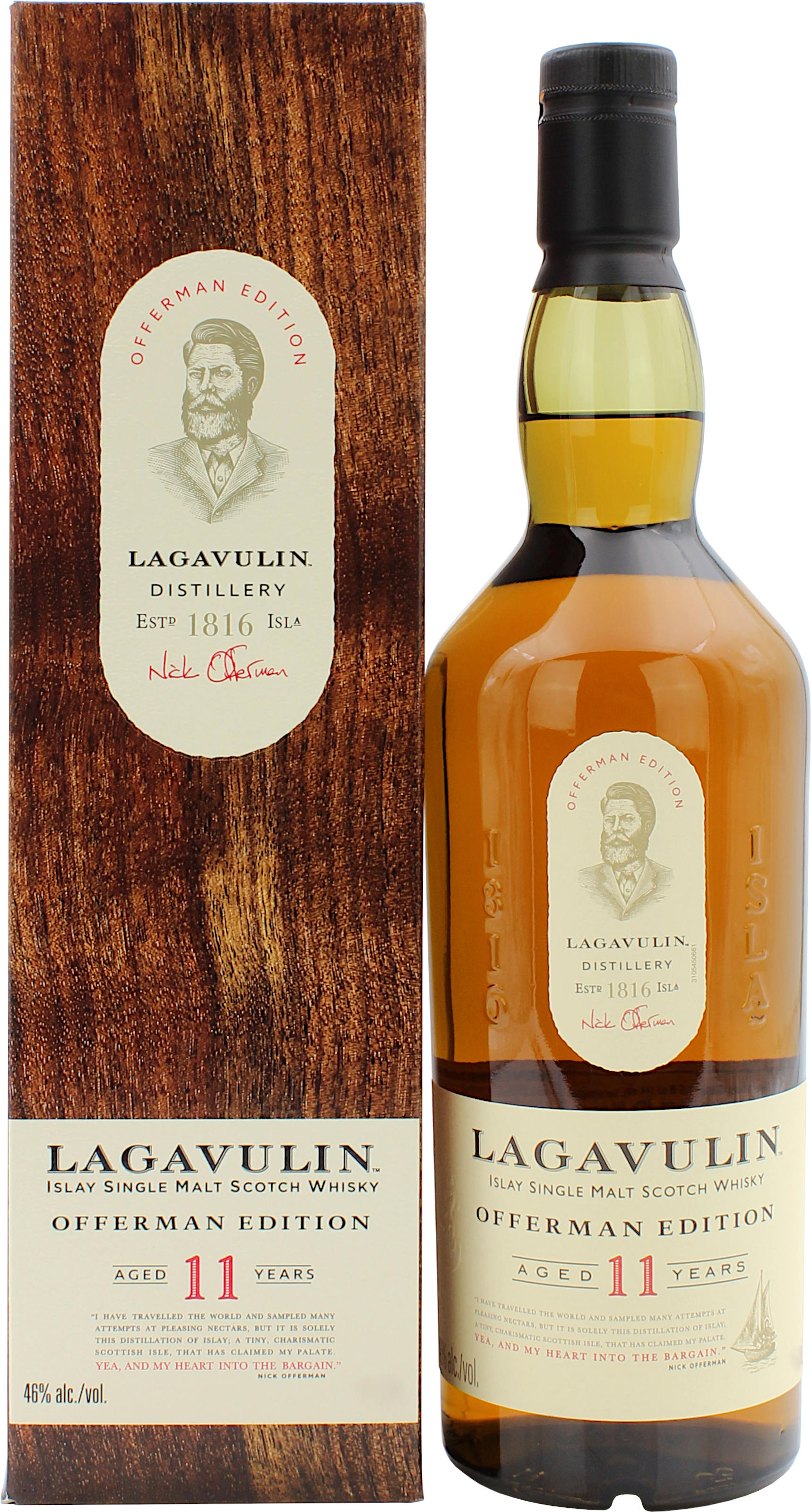 Der Lagavulin 11 Jahre Offerman Edition ist eine limitierte Abfüllung zu Ehren von Nick Offerman. Der amerikanische Schauspieler Nick Offerman pflegt seit langem eine große Liebe zu Lagavulin und hat bereits mehrere kleine Clips über die Lagavulin Distillerie gedreht und auf Youtube veröffentlicht. In Zusammenarbeit mit dem Distillery Manager Colin Gordon und dem Schauspieler Nick Offerman ist dieser 11 jährige Lagavulin entstanden. Der Lagavulin 11 Jahre Offerman Limited Edition überzeugt mit Aromen von kräftigen Torf, Vanille und die Süße von Rosinen. Im Geschmack zeigen sich vollmundige Noten von klarem Malzgeschmack, Torfrauch und einem leichten Fruchtgeschmack. Abgefüllt wird der Lagavulin 11 Jahre Offerman Limited Edition mit 46% vol. Die Abfüllung ist zurzeit nur auf den US Markt erhältlich gewesen.