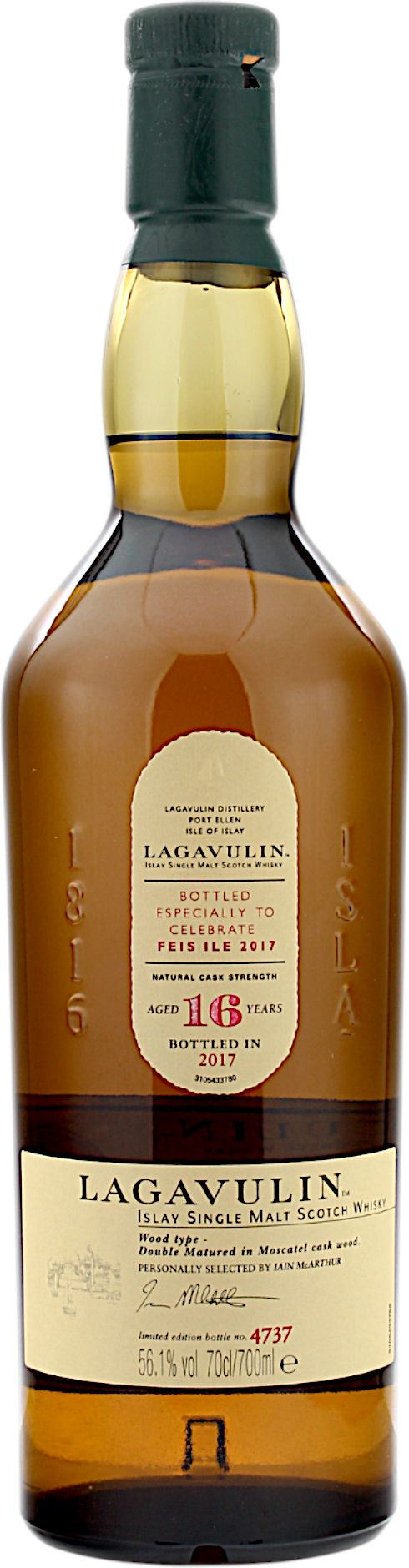 Der Lagavulin 16 Jahre in Fassstärke wurde anlässlich des Islay Festivals 2017 abgefüllt und nur vor Ort in der Brennerei verkauft. Die Auflage ist auf 6.000 Flaschen limitiert und wird nicht gefärbt und nicht kühlgefiltert. Die Lagerung erfolgte in Ex-Bourbonfässern und der Single Malt erhielt anschließend ein Finish in ehemaligen Moscatel Weinfässern. Abgefüllt wurde mit 56.1% vol. Fassstärke.