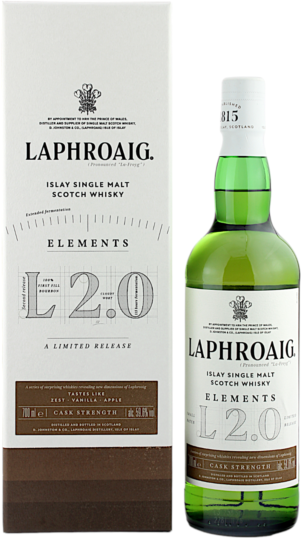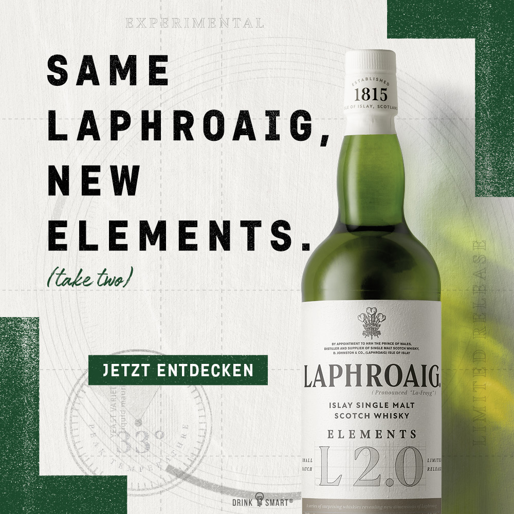 Der Laphroaig Elements 2.0 ist die zweite Auflage der Elementsserie. Bei der aktuellen Abfüllung wird der Einfluss einer längeren Gärzeit auf den Single Malt untersucht. Genauer gesagt wurde eine 115 Stunden Gärung angewendet. Dadurch entstanden enorm fruchtige und malzige Geschmacksnoten, die den typischen Rauchcharakter der Brennerei begleiten. Der Laphroaig Elements 2.0 wurde mit starken 59.6% vol. Fassstärke abgefüllt. Auf Kühlfiltrierung wurde verzichtet.