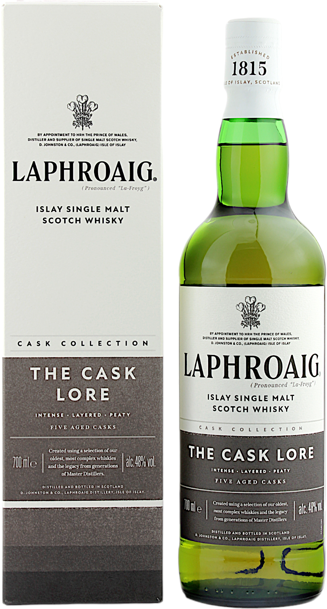 Der Name des Laphroaig Lore leitet sich aus dem Wort Folklore ab und symbolisiert damit die Weitergabe von Wissen und Tradition durch Mundpropaganda. Im übertragenen Sinne ist damit die Weitergabe von Erfahrungen und Fähigkeiten zwischen den einzelnen Distillery Managern Laphroaig´s gemeint. Beim Laphroaig The Cask Lore handelt sich um eine komplexe Zusammensetzung von Single Malts, die ein Alter zwischen sieben und 21 Jahren aufweisen. Diese wurden durch den lebendigen Charakter ehemaliger Bourbon-, europäischer Eichen- und Oloroso-Sherryfässer sowie Quarter Casks bereichert. Bei jedem Genuss dieses Whiskys machen Sie eine Reise durch verschiedene Epochen der Insel Islay, wobei kräftige Aromen von Torfrauch und Gischt sowie subtile Noten von Schokolade und Gewürzen zum Vorschein kommen. Abgefüllt wird der Laphroaig The Cask Lore nicht kühlgefiltert mit 48.0% vol. abgefüllt.