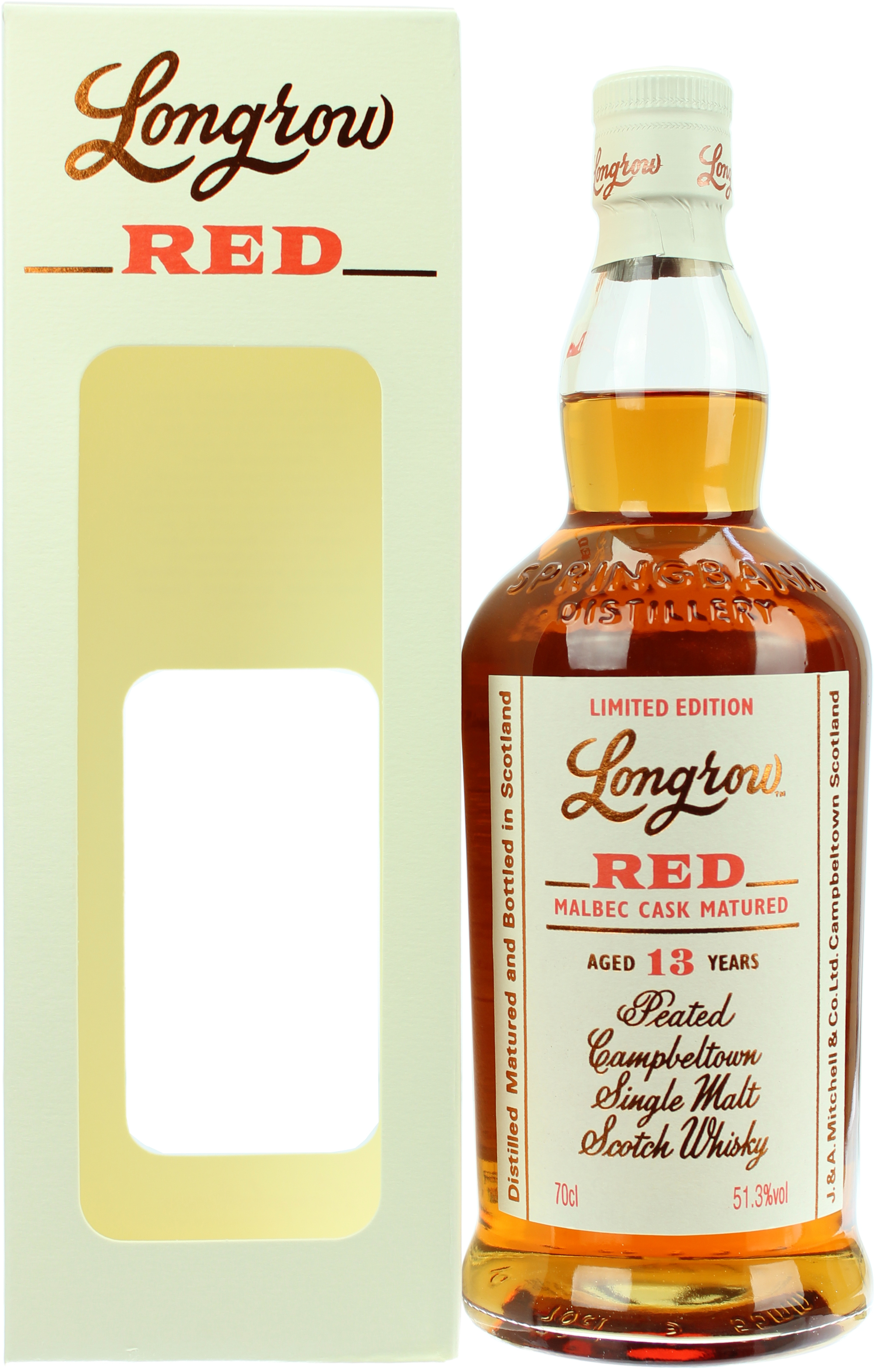 Der Longrow Red Malbec Cask 13 Jahre ist die limitierte Auflage der sehr rauchigen Longrow Abfüllungen aus dem Hause Springbank. Die Auflage ist auf 9.000 Flaschen limitiert und lagerte zunächst für 12 Jahre in Ex-Bourbonfässern und wurde anschließend 15 Monate in ehemaligen Malbec Barrique Rotweinfässern ausgebaut. Dadurch entstehen komplexe Fruchtaromen, die perfekt mit dem Rauch und dem frischen Brennereicharakter von Springbank harmonieren. Der Longrow Red Malbec Cask 13 Jahre wird nicht kühlgefiltert und ungefärbt in Fassstärke mit 51.3% vol. abgefüllt.