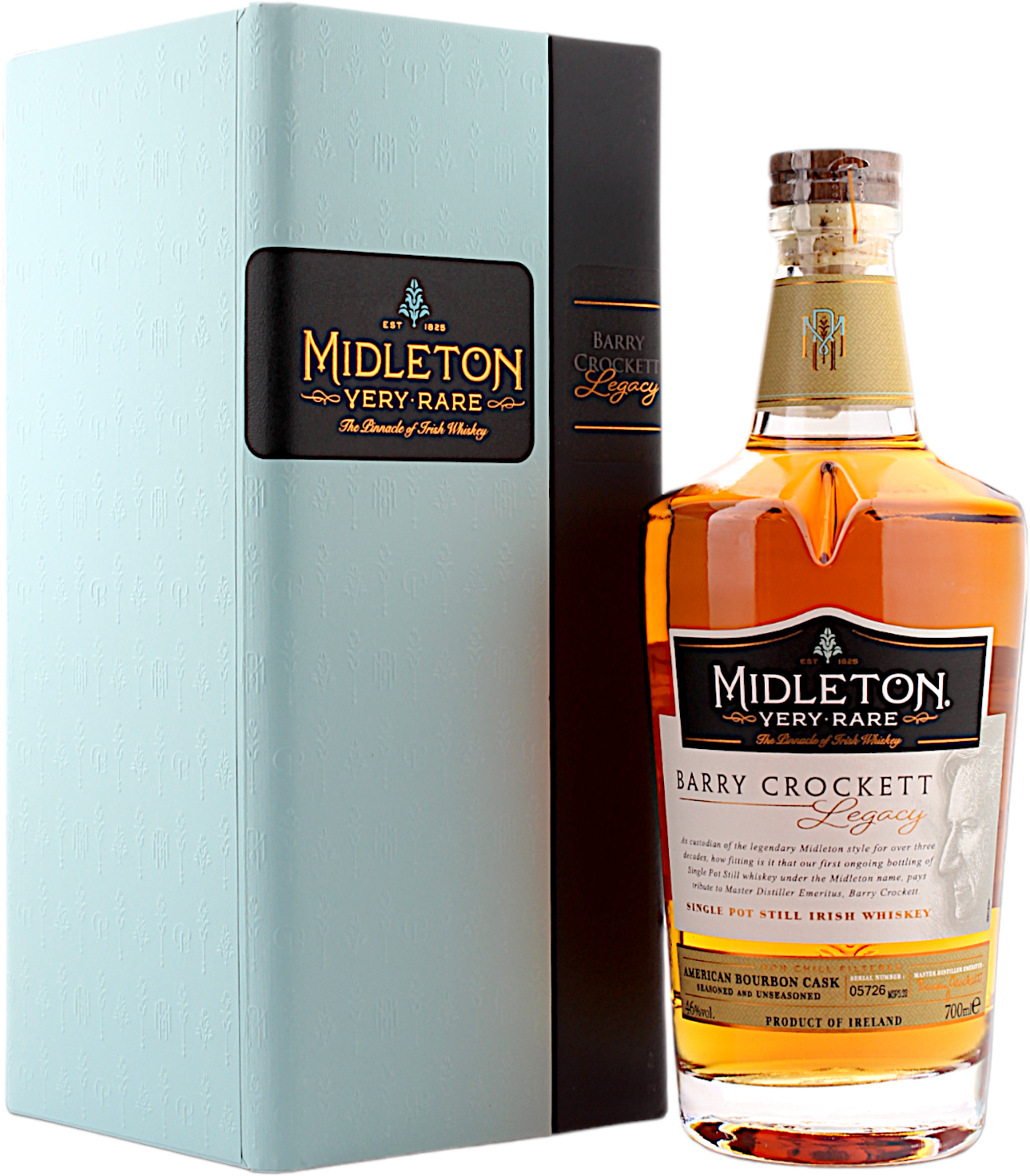 Der Midleton Barry Crockett Legacy ist seit Juli 2011 auf dem Markt und verköpert den typischen Midleton Whiskey mit frischen und angenehmen Geschmacksnoten sowie einer vornehmen Aufmachung. Geliefert wird dieser in einer aufwendigen Umverpackung. Ein echter Hingucker in jeder Sammlung.