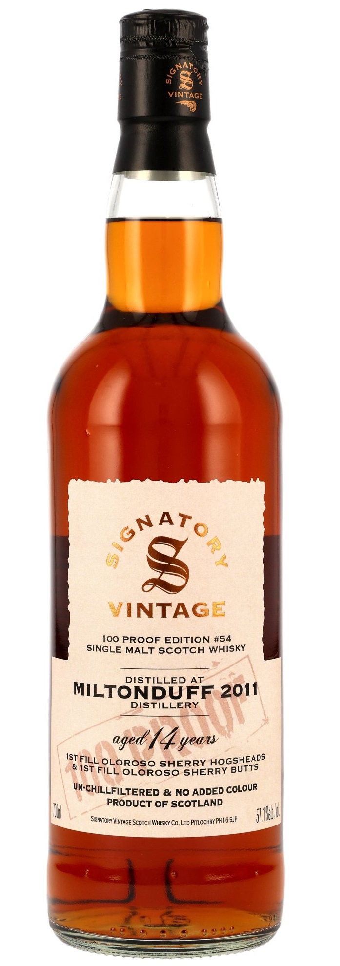 Der Miltonduff 14 Jahre 2011/2025 gehört zur 100 Proof Edition des unabhängigen Abfüllers Signatory. Abgefüllt wurde jeweils mit 57.1% vol, dem Mindestgehalt, ab dem mit Alkohol getränktes Schießpulver entzündet werden kann. Die Lagerung erfolgte in 1st Fill Oloroso Sherryfässern. Die Flaschenanzahl der Abfüllung ist natürlich auf wenige hundert Flaschen begrenzt. Destilliert wurde im Jahr 2011. Abgefüllt wurde der 14-jährige Miltonduff im Jahr 2025. Der Miltonduff 14 Jahre 2011/2025 Signatory 100 Proof Edition #54 ist nicht kühlgefiltert und ungefärbt.