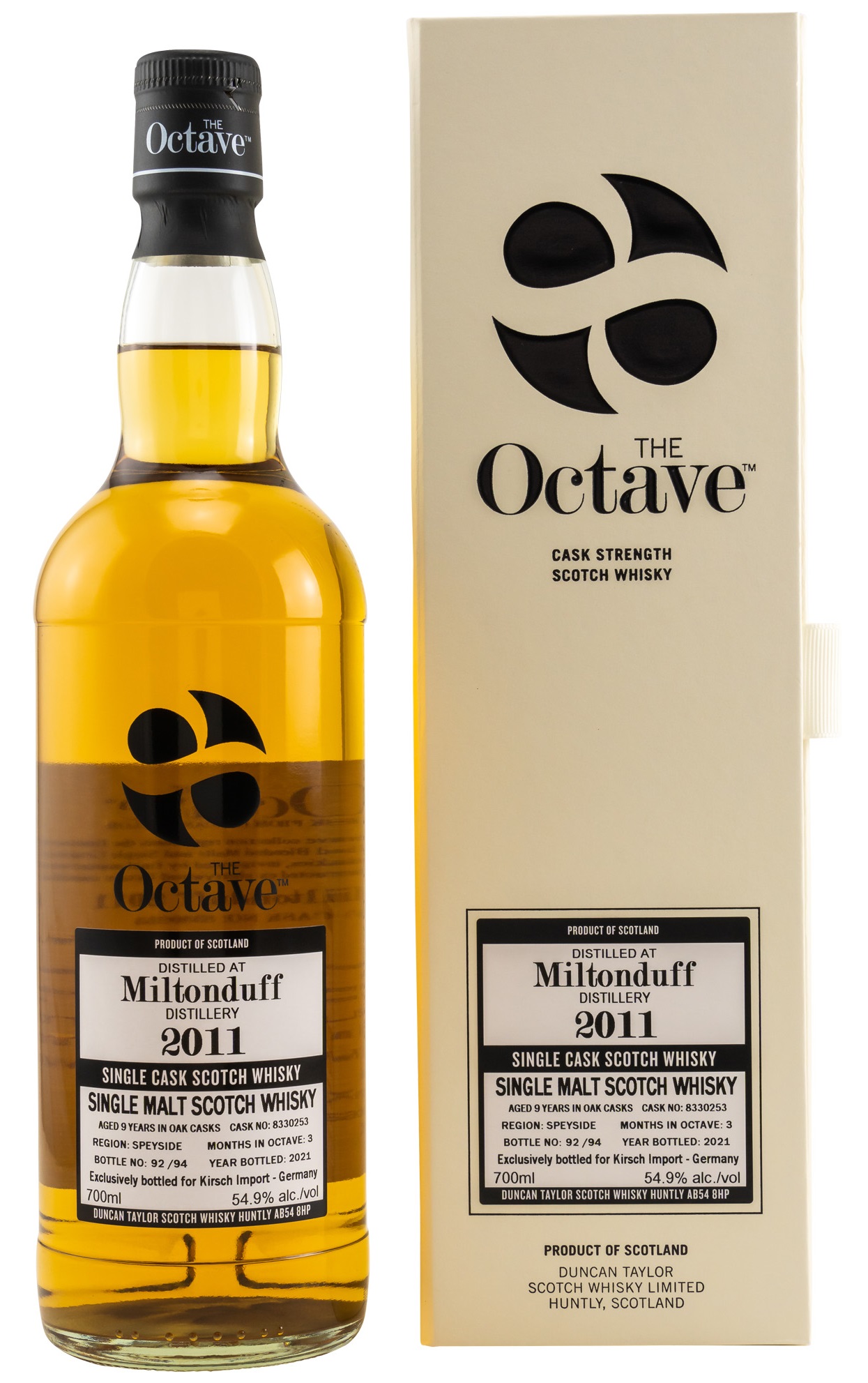 Der Miltonduff 9 Jahre 2011/2021 ist eine Einzelfassabfüllung, welche auf 94 Flaschen limitiert ist. Die Lagerung erfolgte zunächst für ca 9 Jahre in Ex-Bourbonfässer mit einem anschließenden 3-monatigen Finish in einem Octave Fass. Daher hat die Abfüllungsreihe von DuncanTaylor auch ihren Namen. Diese Fässer sind mit ca. 50 Litern viel kleiner als die herkömmlichen Fässer und bieten so mehr Kontakt mit der Fassoberfläche. Dadurch reift der Single Malt schneller und intensiver. Der Miltonduff 9 Jahre 2011/2021 Octave Single Cask wird nicht gefärbt oder kühlgefiltert. Abgefüllt wurde mit Fassstärke und starken 54.9% vol. exklusiv für Kirsch Import.