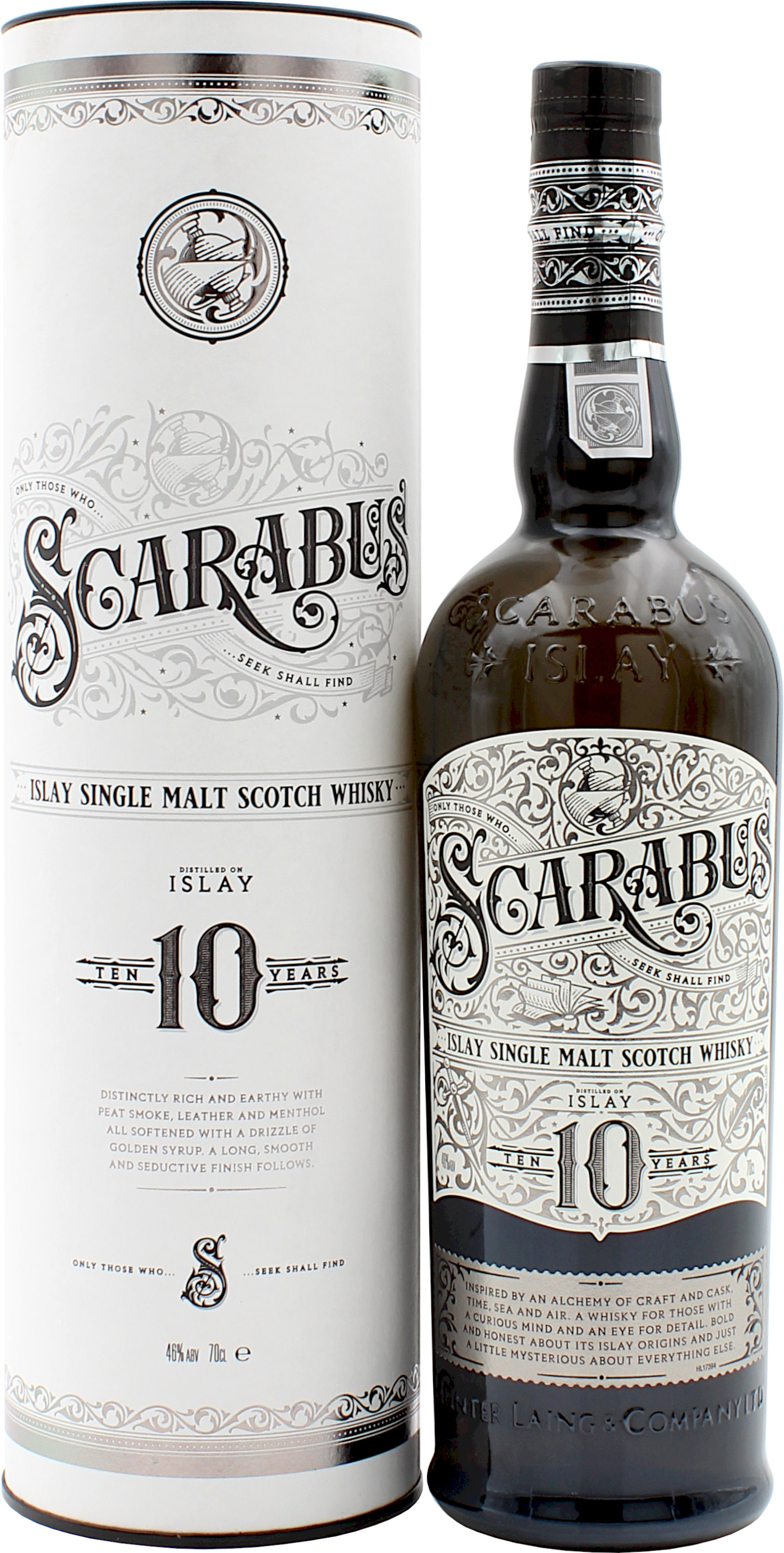 Der Scarabus 10 Jahre stammt vom unabhängigen Abfüller Hunter Laing und ist ein Single Malt aus einer nicht genannten Islay Brennerei. Benannt ist die Abfüllungen nach einem alten mystischen Ort auf der Insel Islay und direkt übersetzt aus den alten nordischen Sprachen bedeutet Scarabus soviel wie "felsiger Ort". Der Single Malt hält sich geschmacklich nicht so bedeckt und zeigt die typischen Islay Malt Charakterzüge. Die Lagerung erfolgte in einem Mix aus Refill Ex-Bourbonfässern und frischen Virgin Oak Fässern. Neben viel Rauch und Zitrus zeigen sich Leder, Süßholz und Menthol. Der Scarabus 10 Jahre Islay Single Malt wird ungefärbt und ungefiltert mit 46.0% vol. abgefüllt.