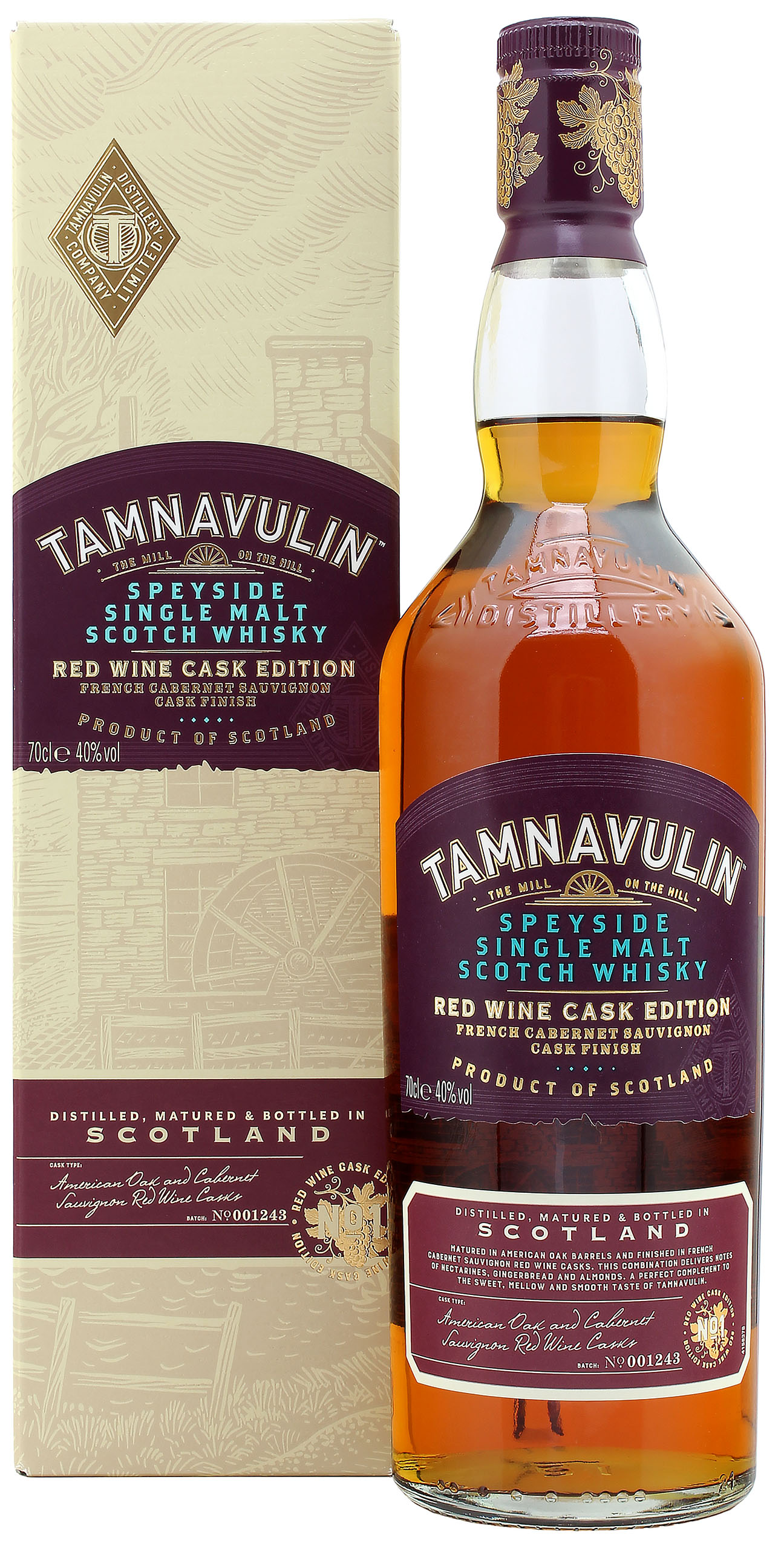 Der Tamnavulin French Cabernet Sauvignon Cask Finish stammt aus einer kleinen Brennerei im Dorf Tomnavoulin, welche nach langer Schließung im Jahr 2007 die Wiedereröffnung feierte. Die Reifung erfolgte zunächst in Ex-Bourbonfässern aus amerikanischer Weißeiche. Anschließend erhielt er ein Finish in französischen Cabernet Sauvignon-Weinfässern, welche dem Whisky die Aromen von reifen dunklen Früchten und exotischen Gewürzen verleihen. Der Tamnavulin French Cabernet Sauvignon Cask Finish wird mit 40.0% vol. abgefüllt.