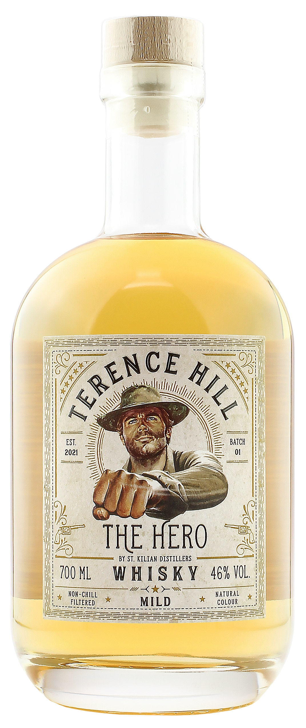 Der Terence Hill The Hero Mild Batch 1 stammt aus der deutschen St. Kilian Brennerei und ist dem legendären Schauspieler Terence Hill gewidmet. Für die The Hero Abfüllung vermählte die St. Kilian Brennerei Whisky mit Ex-Rum Fassnoten aus den eigenen Beständen mit dreifach destilliertem Whiskey, welcher seine Reifung in amerikanischen Ex-Bourbon Fässern erhielt. So entstand ein Whisky mit Aromen von tropischen Früchten, würzigem Eichenholz und Vanille. Im Geschmack zeigen sich reife Ananas, sonnengereifte Bananen und Karamell. Der Terence Hill The Hero Mild Batch 1 wird mit 46.0% vol. abgefüllt. Auf Kühlfitrierung und Farbstoff wurde verzichtet.