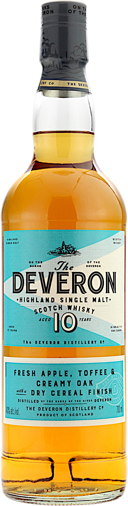 Der The Deveron 10 Jahre stammt aus der Macduff Brennerei und war bisher unter dem Namen Glen Deveron bekannt. Das Design wurde komplett überarbeitet, aber der charakteristische Geschmack ist geblieben. The Deveron ist bekannt für fruchtige Noten von grünen Äpfeln, Karamell und etwas Zimt. Die Lagerung ist mit "Oak Casks" angegeben und lässt auf einen Ausbau in Ex-Bourbonfässer schließen. Macduff führt den Brennereicharakter auf die Anordnung der Kondensatoren zurück. Diese sind für die Wash Stills und die Spirit Stills unterschiedlich angeordnet. Der Deveron 10 Jahre wird mit 40% vol. abgefüllt.
