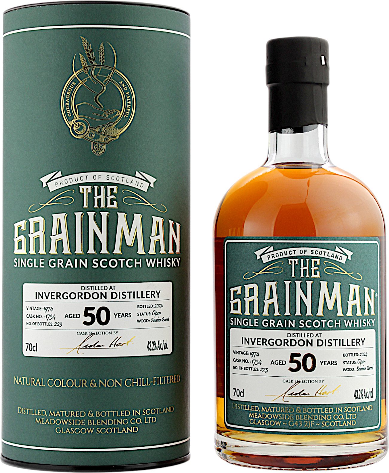 Aus der legendären Invergordon-Destillerie präsentiert The Grainman eine außergewöhnliche Rarität: den 50 Jahre alten Single Grain Whisky, abgefüllt von Meadowside Blending (MBl). Dieser Whisky ist Teil der renommierten The Grainman-Serie und stammt aus Bourbon Barrel Nr. 1734, Jahrgang 1974, abgefüllt im Jahr 2024. Mit einer limitierten Auflage von nur 223 Flaschen ist diese Flasche ein exklusives Sammlerstück für Kenner und Liebhaber. Die Reife über ein halbes Jahrhundert verleiht diesem Single Grain eine unvergleichliche Tiefe, Komplexität und Eleganz, während die 43.2 % vol. für einen sanften, dennoch ausdrucksstarken Genuss sorgen.
