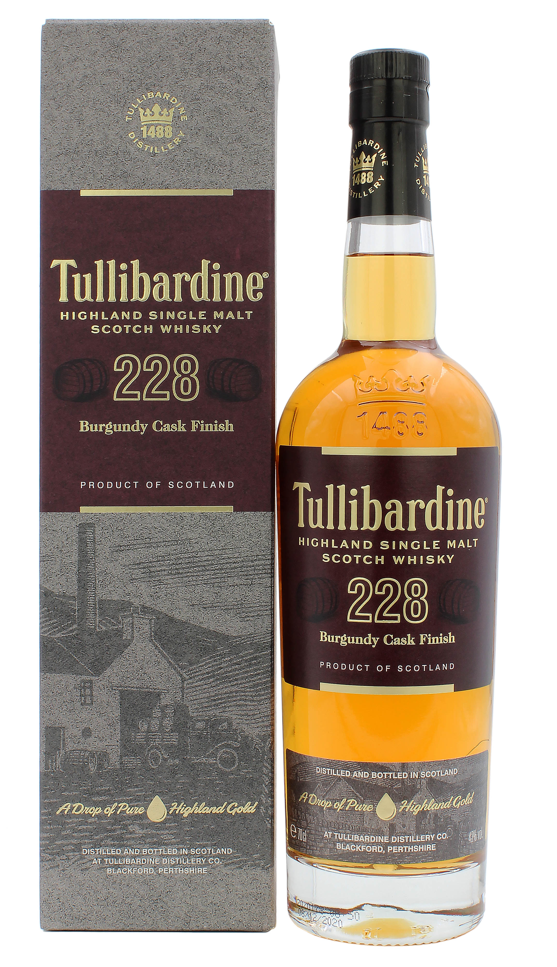 Die in den schottischen Highlands gelegene Tullibardine Distillery wurde im Jahr 1949 von William Delmé-Evans gegründet. Der Tullibardine 228 Burgundy Finish erhielt seine Bezeichnung von den 228 Liter Burgundyfässern aus dem Chateau de Chassagne Montrachet , in denen dieser Single Malt sein 12-monatiges Finish und seine rubinrote Farbe erhielt. Grundlage des Tullibardine 228 ist der in firstfill exBourbon Fässern gereifte Sovereign, der durch die Nachlagerung elegante Noten von Vanille, Milchschokolade und fruchtige Erdbeeren annimmt. Der vorzügliche Tullibardine Burgundy Finish Highland Single Malt Scotch Whisky aus Schottland steht für einen unnachahmlichen Charakter und hoher Qualität.