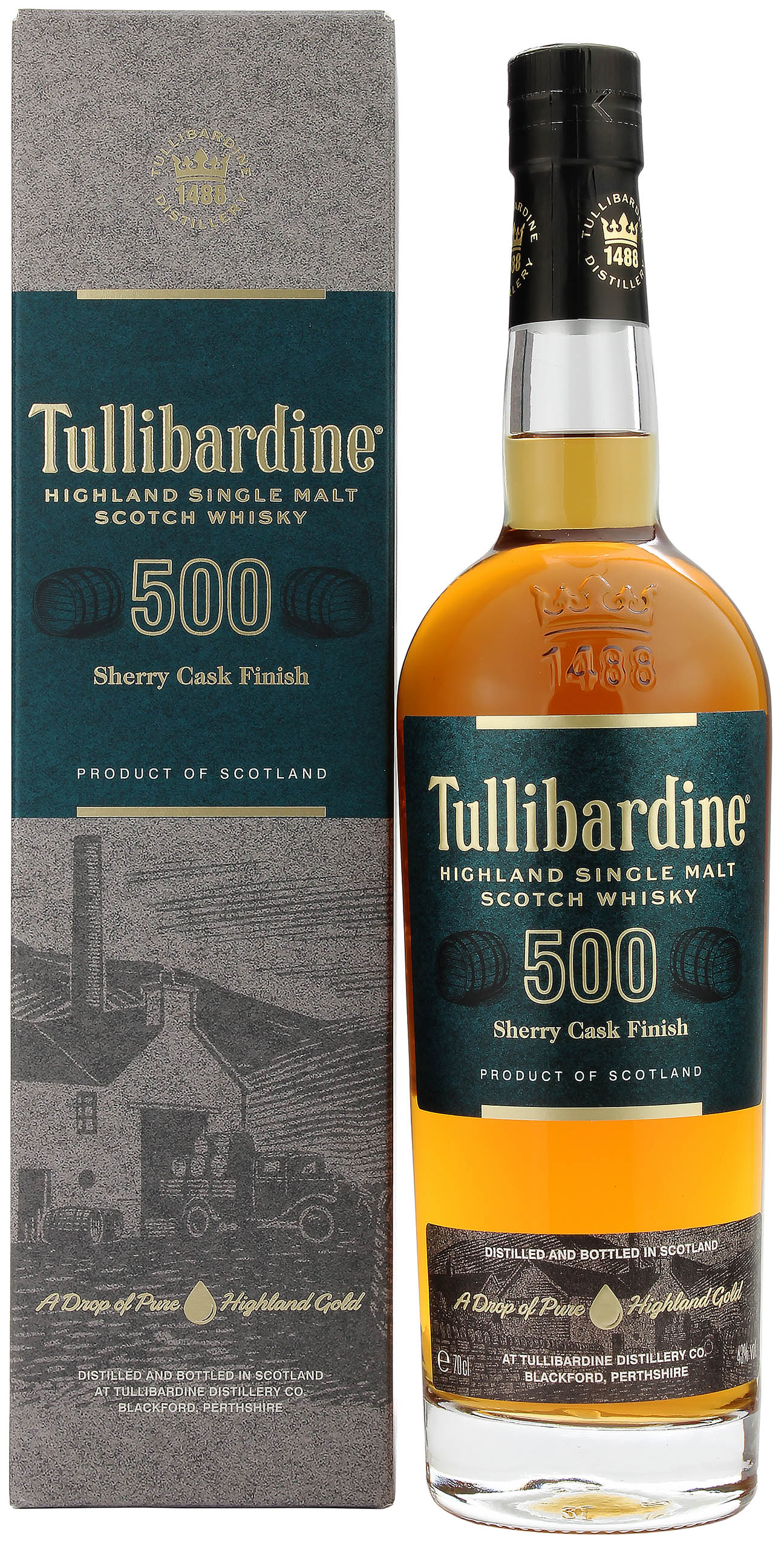 Die Brennerei Tullibardine wurde 1949 von William Delmè-Evans in Blackford gegründet. Der Tullibardine 500 Sherry Finish hat eine dunkle, an Kupfer erinnernde Farbe, die ohne Zusatz von Zuckercouleur erreicht wurde und bereits hier eindrucksvoll den Einfluss des Sherryfasses deutlich macht. Der Tullibardine 500 Sherry Finish wird mittels zweifacher Destillation in Kupferbrennblasen aus ungetorftem Gerstenmalz und dem Wasser des Danny Burn der nahen Ochil Hills gewonnen. Zunächst gelangt der New Make Spirit für eine nicht bekannte Dauer in First-Fill-Bourbonfässer. Dadurch erhält der Single Malt angenehme Vanille- und Karamelltöne. Anschließend erhält der Whisky ein zwölfmonatiges Finish in Ex-Sherry-Fässern in denen vorher Pedro Ximenez Sherry enthalten war. Diese Fässer haben ein Fassungsvermögen von 500 Litern. Dadurch kommen fruchtige Noten und Gewürzaromen dazu. Die Balance aus Süße, Frucht und Würze geht mit einer ordentlichen Kraftentfaltung einher. Der Tullibardine 500 Sherry Finish enthält keine künstlichen Farbstoffe, ist nicht kältefiltriert und kommt mit angenehmen 43% Vol in die Flasche.