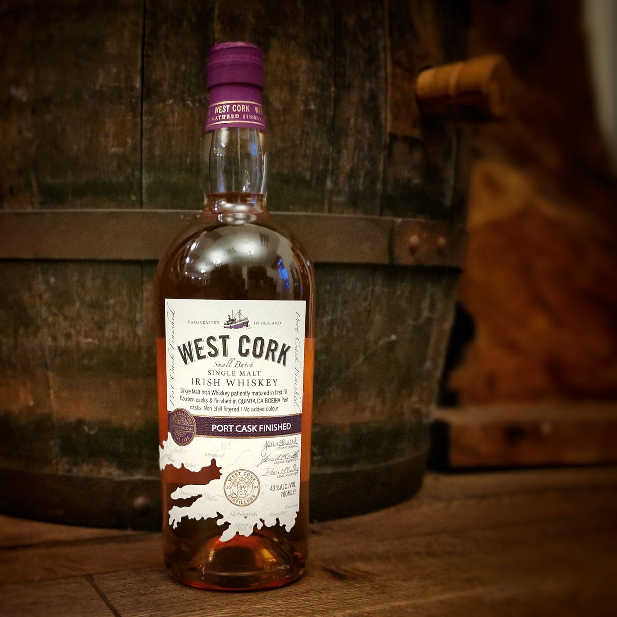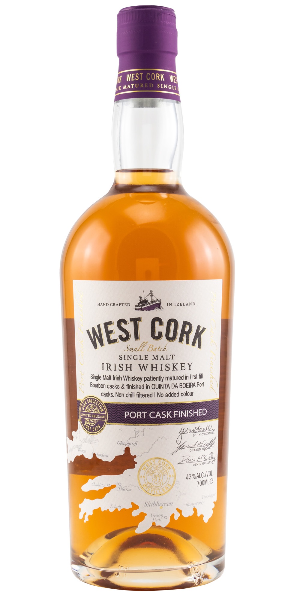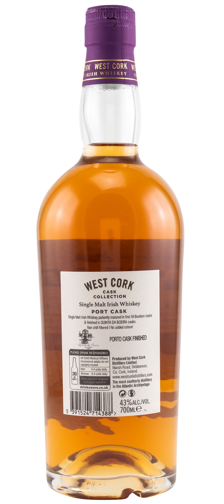 Der West Cork Port Cask Finish ist eine limitierte Abfüllung der gleichnamigen jungen Brennerei. Die Lagerung erfolgte in Ex-Bourbonfässern mit einem Finish in Portweinfässern aus der Douro Region in Portugal. Der West Cork ohne Altersangabe ersetzt die 12-jährige Abfüllung. Die fruchtige Portweinnote ergänzt perfekt die frischen, weichen Noten des West Cork Single Malts. Mit dem Neudesign verzichtet West Cork gleichzeitig auf Farbstoff und Kühlfiltration. Der West Cork Port Cask Finish wird mit 43.0% vol. abgefüllt.