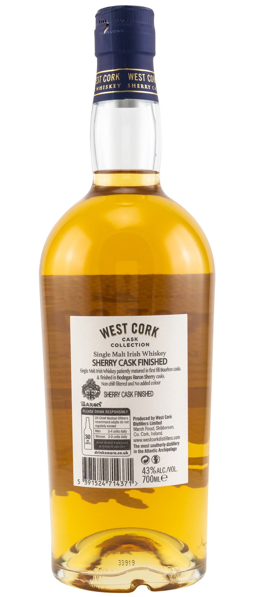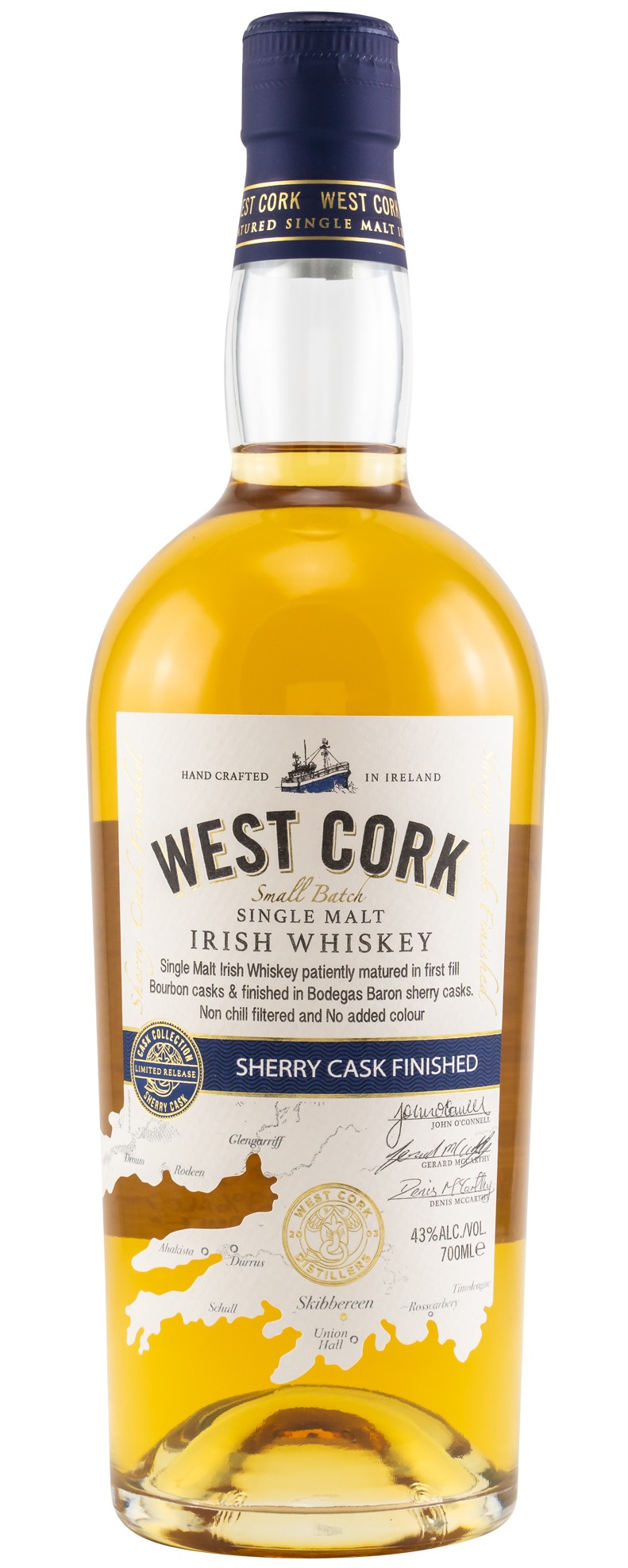 Der West Cork Cask Finish ist eine limitierte Abfüllung der gleichnamigen jungen Brennerei. Die Lagerung erfolgte in Ex-Bourbonfässern mit einem Finish in ehemaligen PX Sherryfässern aus Spanien. Die Abfüllung ohne Altersangabe ersetzt die 12-jährige Abfüllung. Die fruchtige und würzige Sherrynote ergänzt perfekt die frischen, weichen Noten des West Cork Single Malts. Mit dem Neudesign verzichtet West Cork gleichzeitig auf Farbstoff und Kühlfiltration. Der West Cork Sherry Cask Finish wird mit 43.0% vol. abgefüllt.