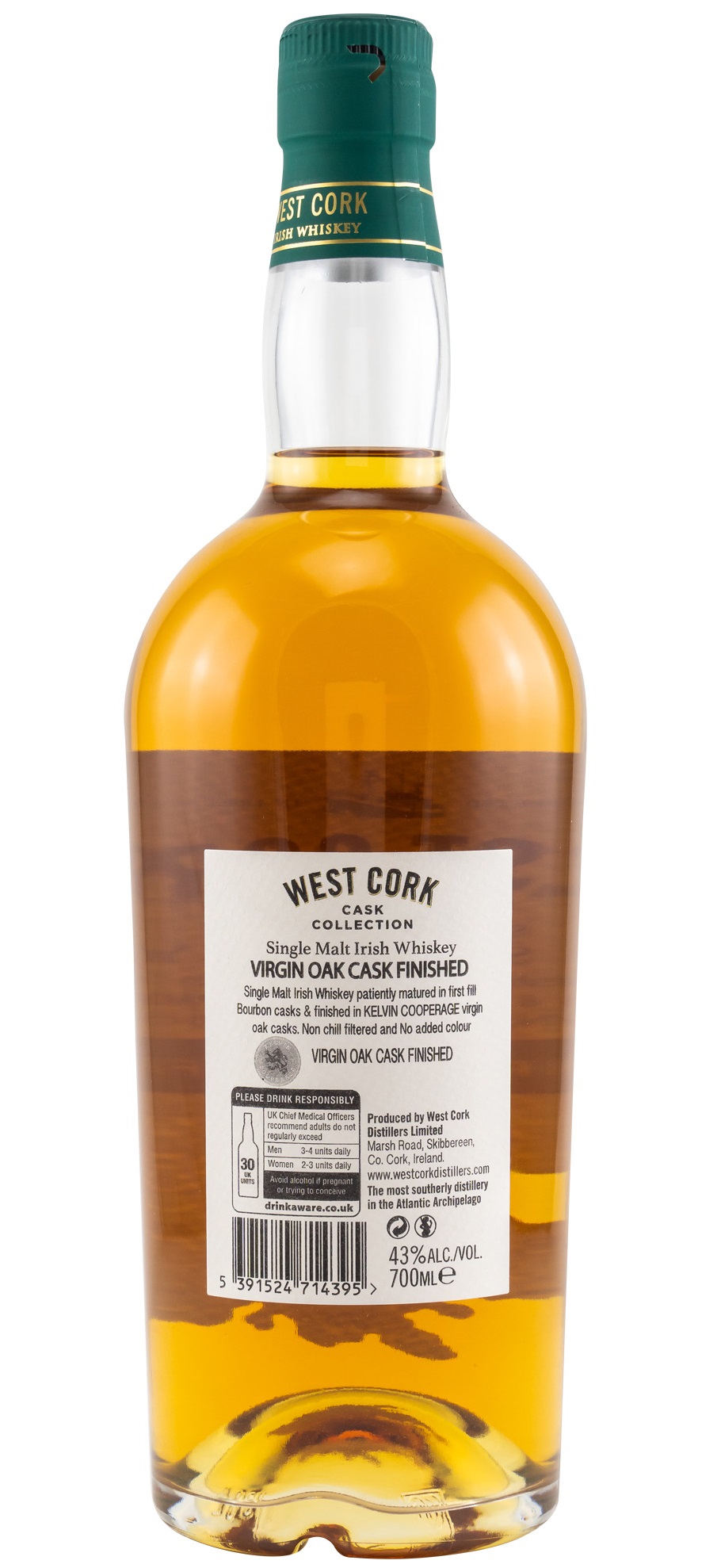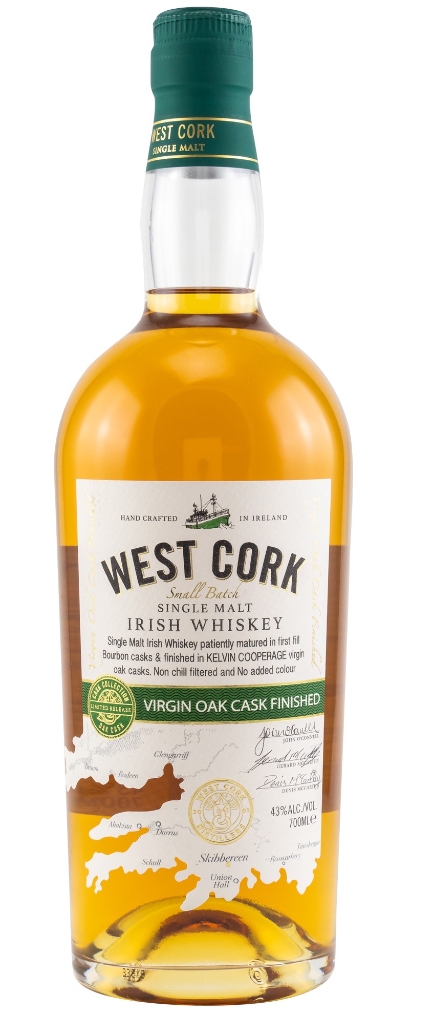 Der West Cork Virgin Oak Cask Finish ist eine Neuauflage der Cask Finish Serie der gleichnamigen jungen Brennerei. Die Lagerung erfolgte in First Fill Ex-Bourbonfässern mit einem Finish in frischen "Virgin" Oak Fässern aus der Kelvin Cooperage Louisville USA. Die fruchtige Grundnoten des West Cork Brennereicharakters werden mit Gewürzen, Vanille und frischem Holz ergänzt. Mit dem Neudesign verzichtet West Cork gleichzeitig auf Farbstoff und Kühlfiltration. Der West Cork Virgin Oak Cask Finish wird mit 43.0% vol. abgefüllt.