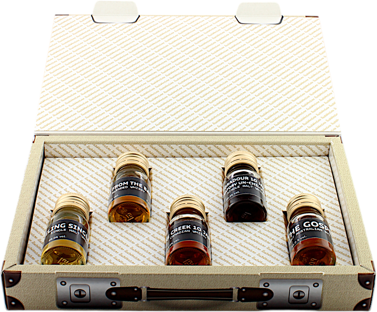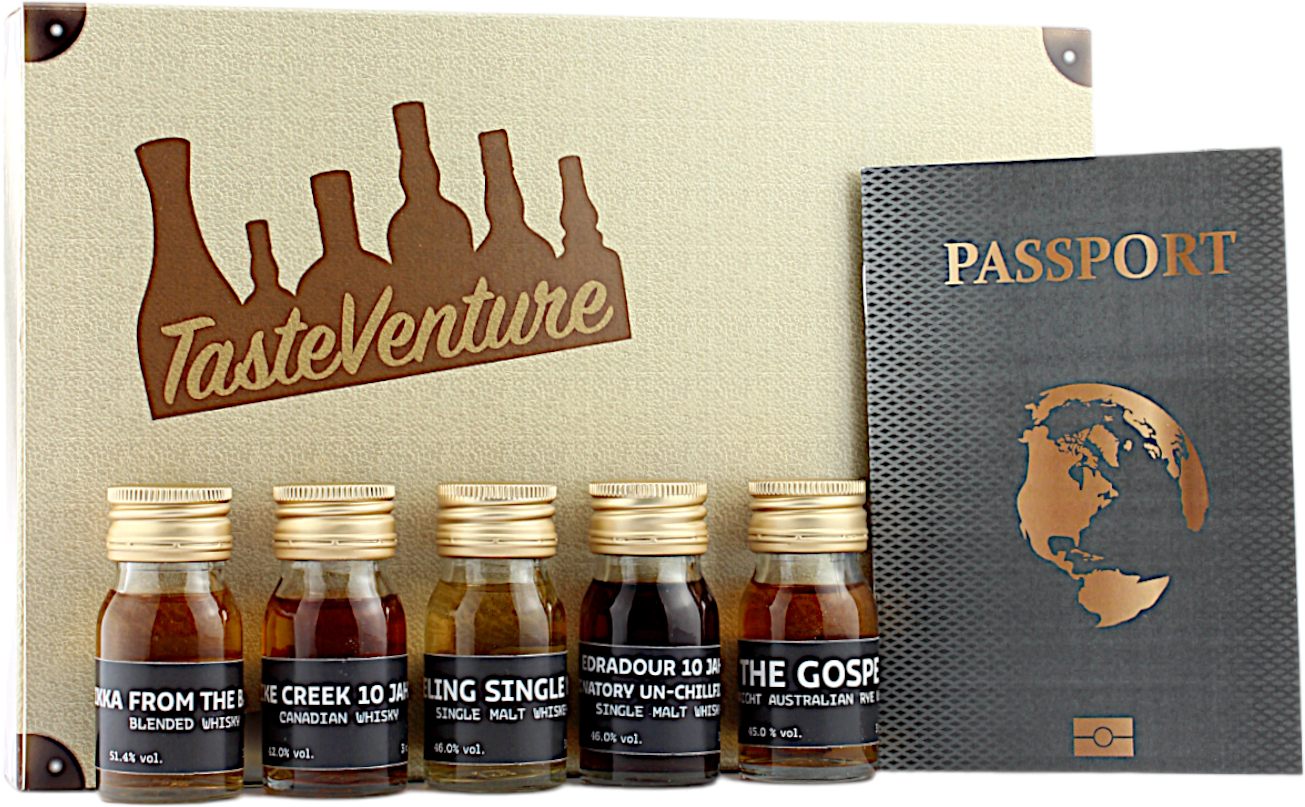 Das World of Whisky Tasting Probierset wurde exklusiv von Tasteventure zusammengestellt. Die Edition "International Whisky Journey" überzeugt mit gleich 5 hochwertigen Whisky-Abfüllungen, die zu den besten aus der ganzen Welt gehören. Die Box beinhaltet 5 x 30 ml aufeinander abgestimmte Abfüllungen sowie ein hochwertiges Begleitheft mit allen Informationen zu den Whisky-Sorten: